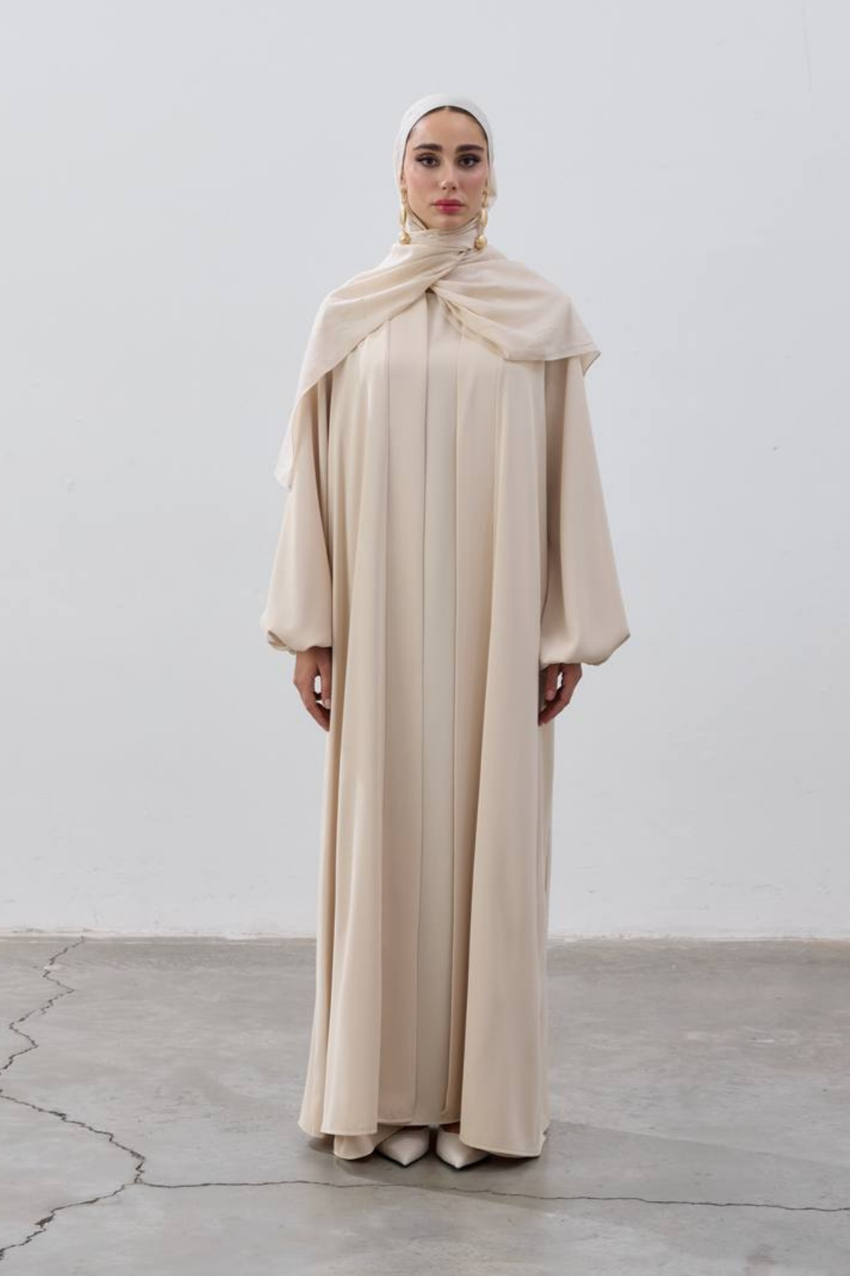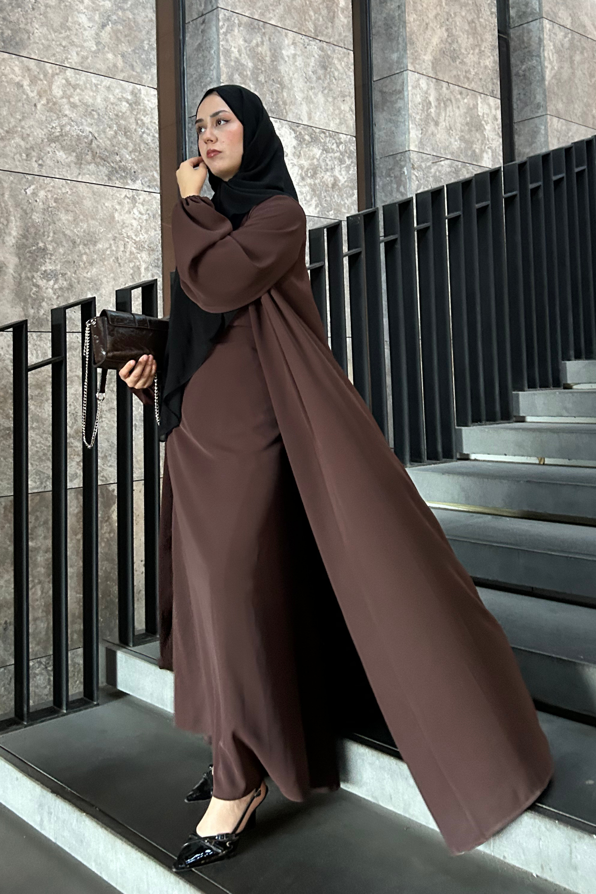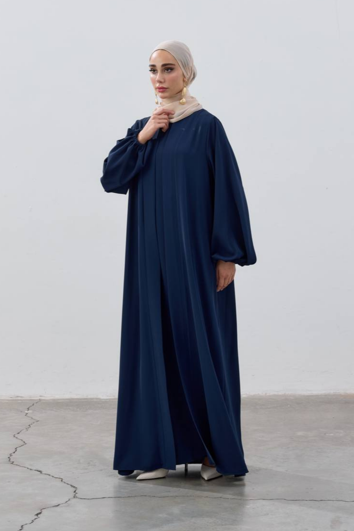 Tags: abaya set, balloon sleeves, elegant style, luxury fashion, modern abaya, modest wear, premium collection, Santiago fabric, two-piece outfit