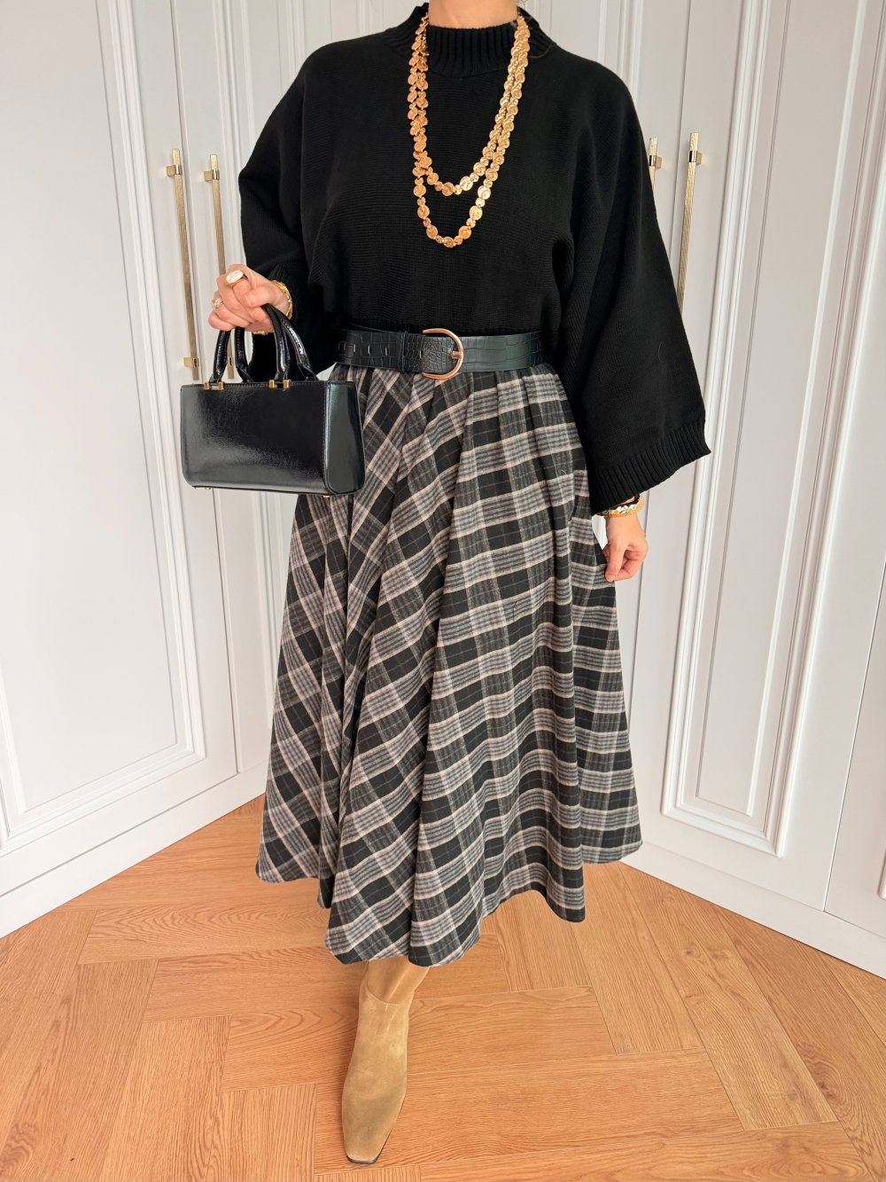 Tags: black skirt, elastic waist skirt, flowy skirt, plaid skirt, women's fashion