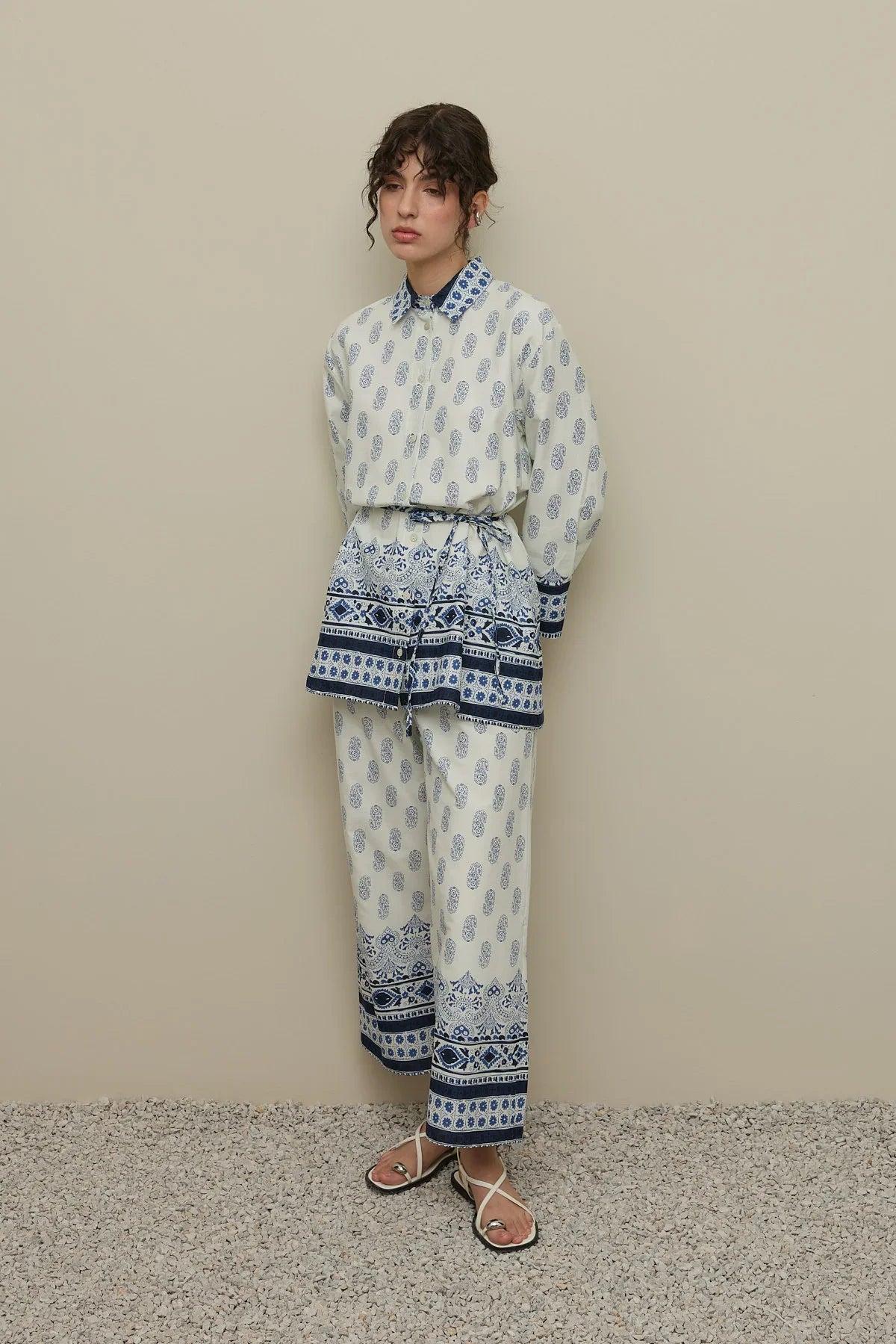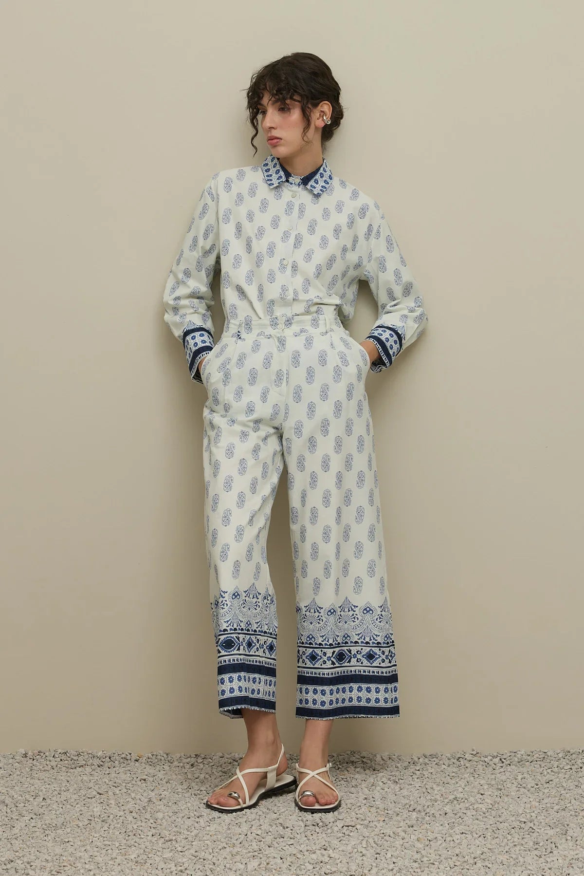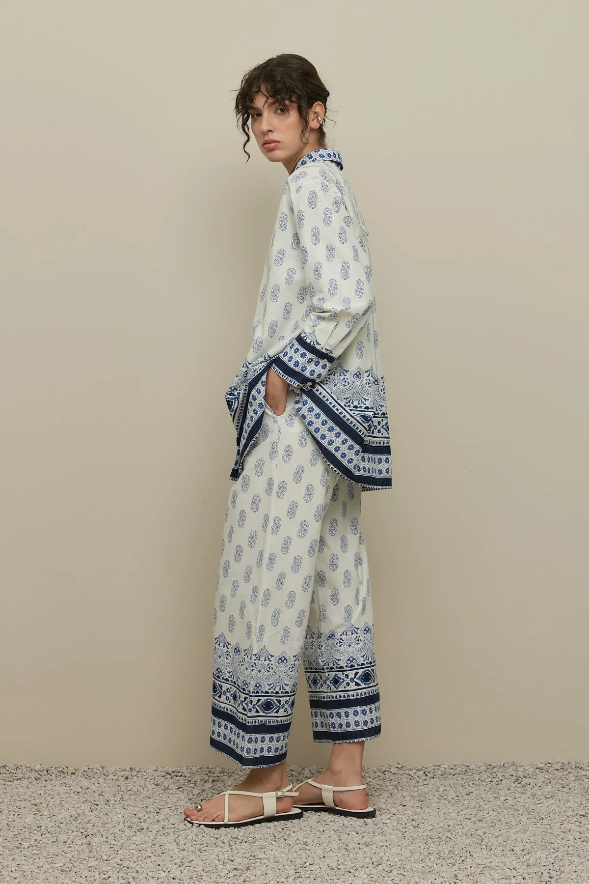 Featuring a shirt collar, button front, lined, 100% cotton woven patterned fabric, cuffed long-sleeve shirt and culotte-style pants with a button front, zip closure, and elasticated back waist.