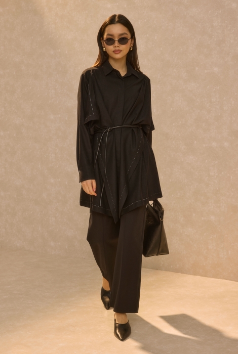 Shirt made from 50% linen and 50% viscose, featuring panel details on the front, a collar, and decorative topstitching. Thanks to its natural fabric, it keeps you cool throughout the summer, while the loose cut ensures all-day comfort. It has a true-to-size fit, so you can choose the size you normally wear. The belt is included with the product.Lenght: 80 cm (Product lenght may vary by 1-5 cm between production batches.) Size Chart : Bust Hips Biceps Sleeve Size 36: 108 cm 110 cm 41 cm 58 cm Size 38: 112 cm 114 cm 43 cm 59 cm Size 40: 116 cm 118 cm 45 cm 60 cm Size 42: 120 cm 122 cm 47 cm 61 cm Model’s Measurements: Height: 170 cm Bust: 82 cm Waist: 62 cm Hips: 88 cm The Size Worn by the Model: 36