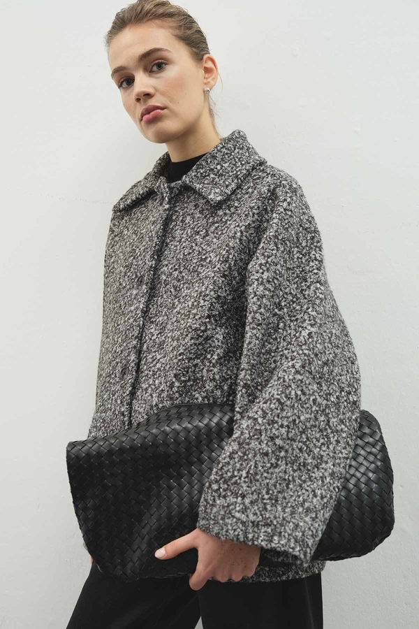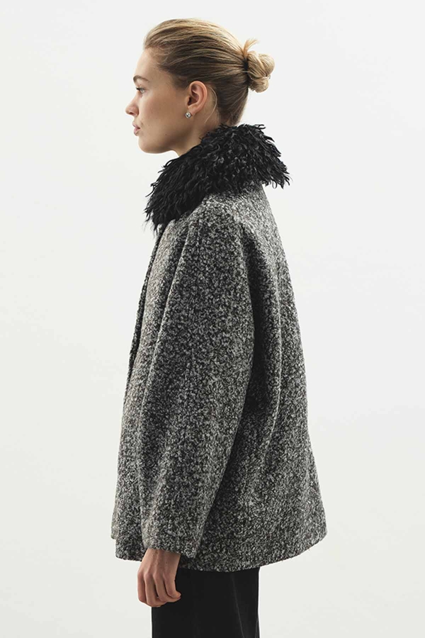 SHORT BLACK COAT WITH FUR COLLAR FEATURES