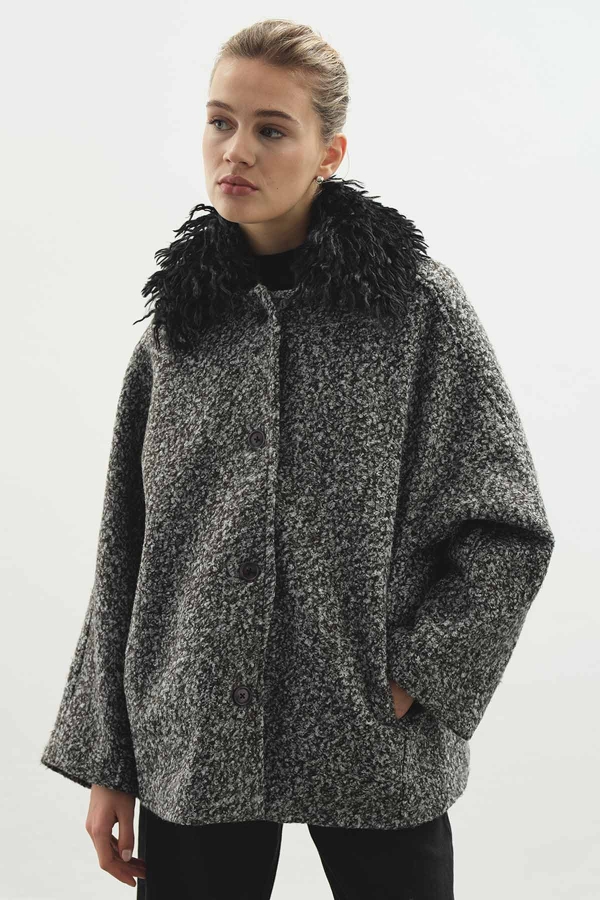 Detachable fur collar, button closure, pockets, dropped shoulders, comfortable fit, lined short coat with fur collar.