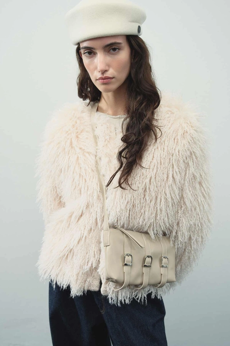 SHORT ECRU FAUX FUR JACKET FEATURES Biker collar, clasp closure, soft texture, regular fit, lined short faux fur jacket. COMPOSITION AND CARE 100% Polyester. Dry cleaning recommended. Hand measurements may vary by 2-3 cm. Model Size: S-M. Model Measurements: Height: 176 cm, Bust: 79 cm, Waist: 64 cm, Hips: 92 cm