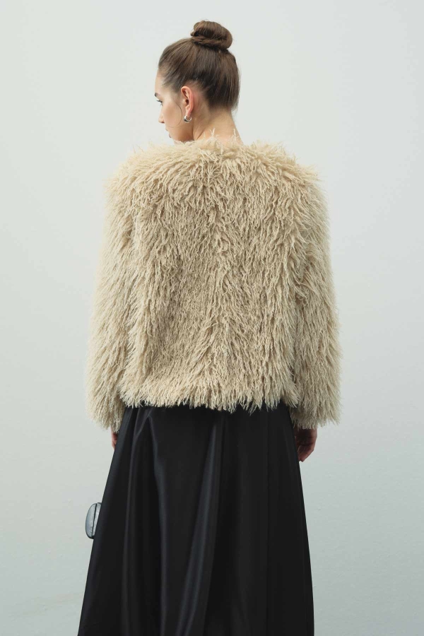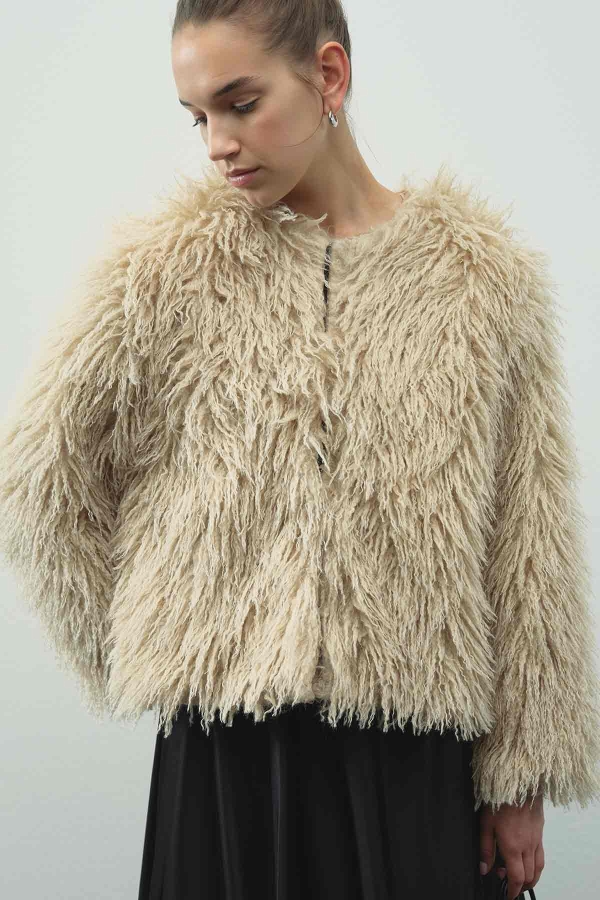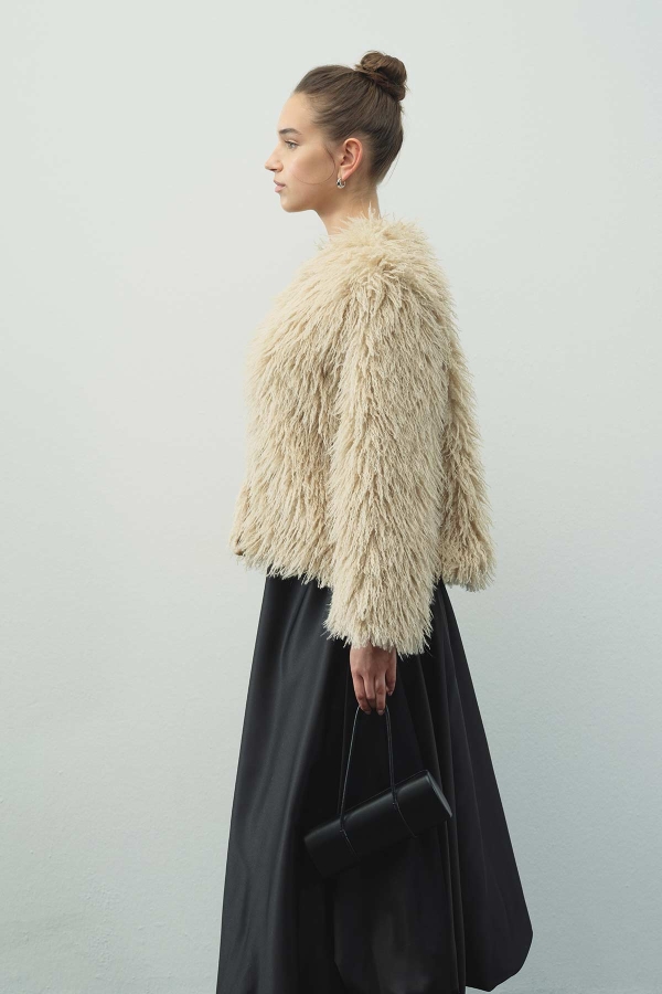 SHORT FAUX FUR MINK JACKET FEATURES: Bicycle collar, clasp closure, soft texture, regular fit, lined short faux fur jacket. CONTENT AND CARE: 100% PES. Dry cleaning recommended. Hand measurements may vary by 2-3 cm. Model Size: S-M. Model Measurements: Height: 178 cm, Bust: 90 cm, Waist: 62 cm, Hips: 92 cm