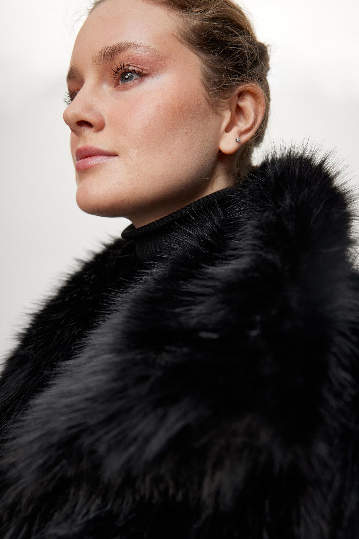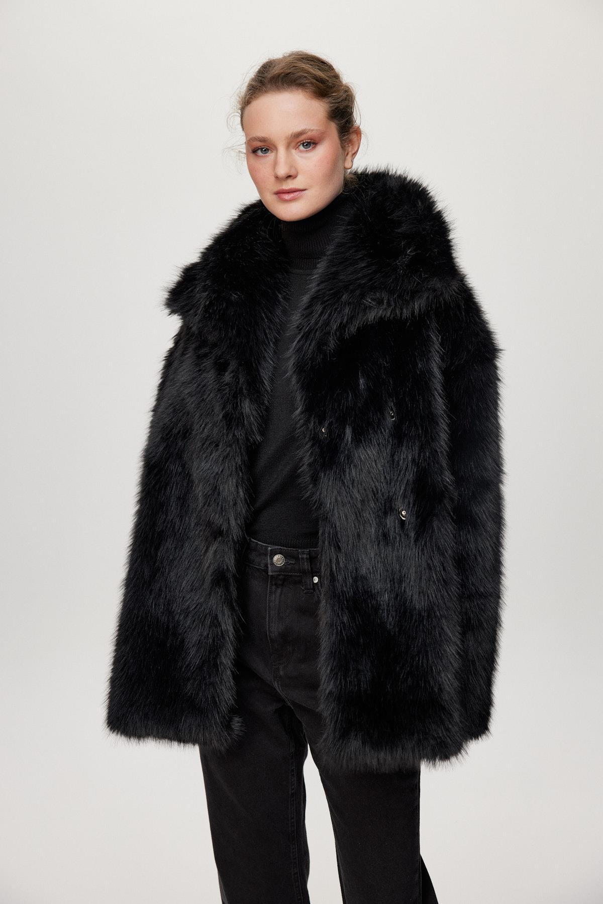 Tags: black coat, fashion coat, fur coat, outerwear, plush coat, short coat, winter coat, women's coat
