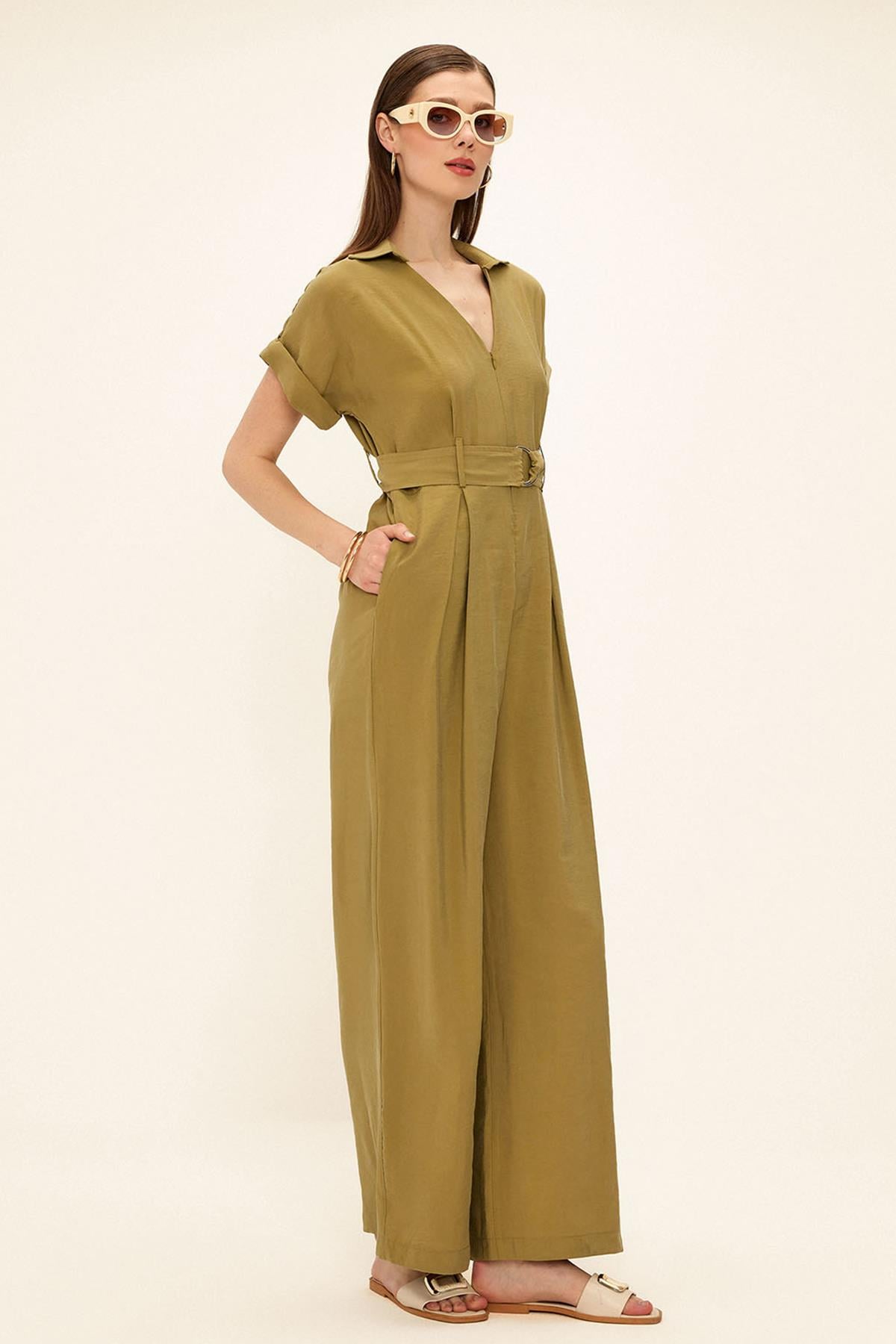 Short Sleeve Belt Detail Modal Jumpsuit GREEN 9342