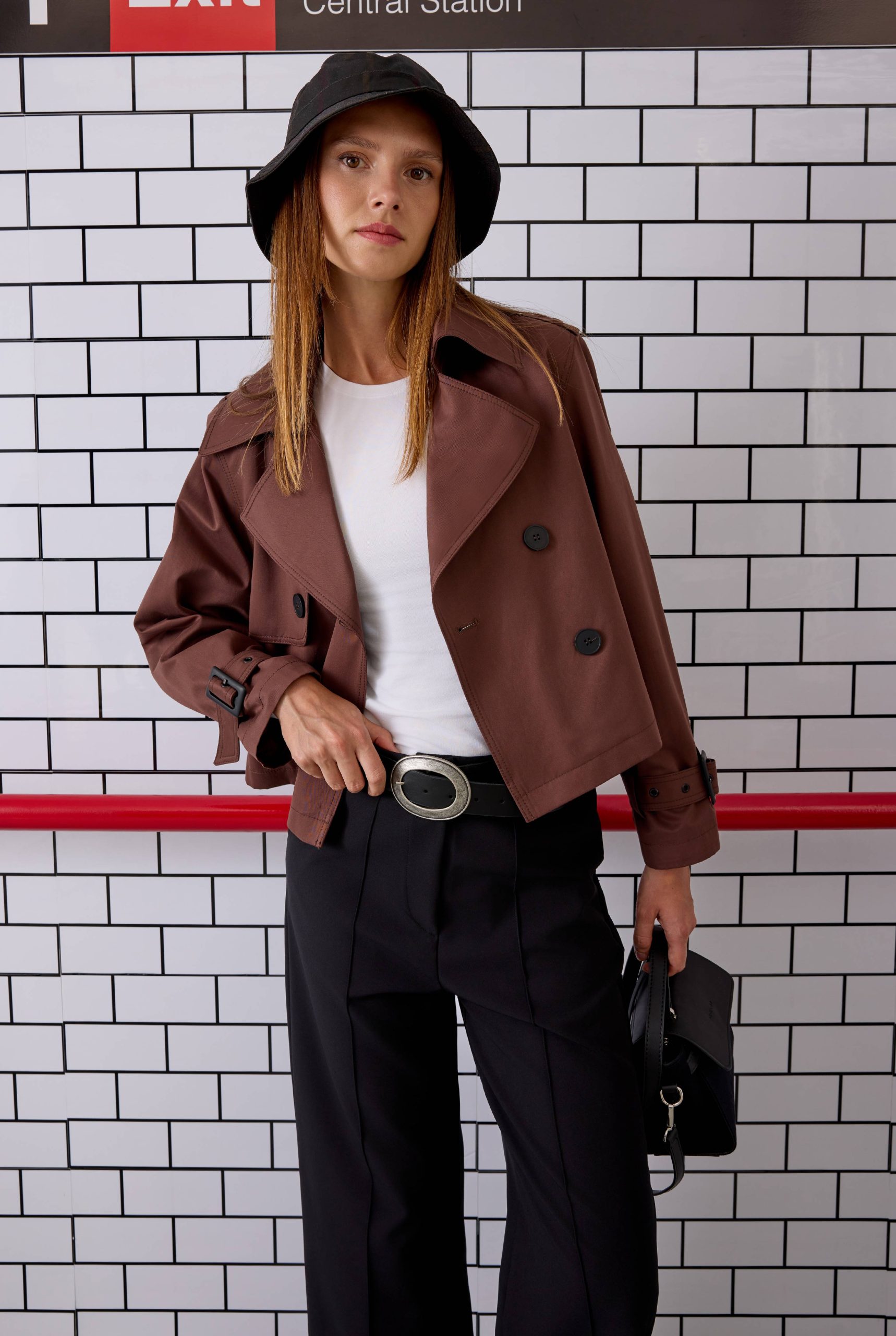 Crafted from a blend of 60% cotton and 40% polyester fabric. The cotton content ensures breathability and comfortable wear, while the polyester weave adds extra durability to the product. This makes the trench coat more resistant to wear and tear, maintaining its shape for longer. Additionally, the water-repellent treatment applied to the polyester content provides water-resistant properties, ideal for trench coats. The product features a lightweight, relaxed fit. The model is wearing size 36. For a more fitted look, consider sizing down. Fabric care note: For long-lasting use of cotton-blend fabrics, it is recommended to wash on a delicate cycle at low temperatures. Air dry on a hanger. Steam iron at medium heat. Length: 51.5 cm (Product length may vary by 1-5 cm between productions). Sizing Information: Chest, Hips, Sleeve Length, Bicep. Size 36: 106 cm, 102 cm, 57 cm, 44 cm. Size 38: 110 cm, 106 cm, 58 cm, 46 cm. Size 40: 114 cm, 110 cm, 59 cm, 48 cm. Size 42: 118 cm, 114 cm, 60 cm, 50 cm. Model Measurements: Height: 174 cm, Chest: 83 cm, Waist: 60 cm, Hips: 90 cm. Model is wearing size 36.