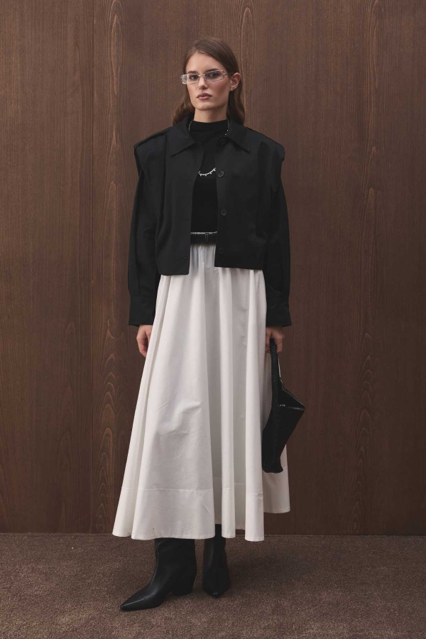 FEATURES OF THE SHOULDER-PADDED GABARDINE SHORT BLACK JACKET: Shoulder-padded, front-buttoned crop jacket with pleat and epaulet details, comfortable fit, and lined construction. CONTENT AND CARE: 60% Cotton, 40% Polyester. Should be washed at 30°C on delicate, synthetic, and gentle cycles. Hand measurements may vary by 2-3 cm. Model Size: S-M. Model Measurements: Height: 174 cm, Bust: 78 cm, Waist: 58 cm, Hips: 87 cm.
