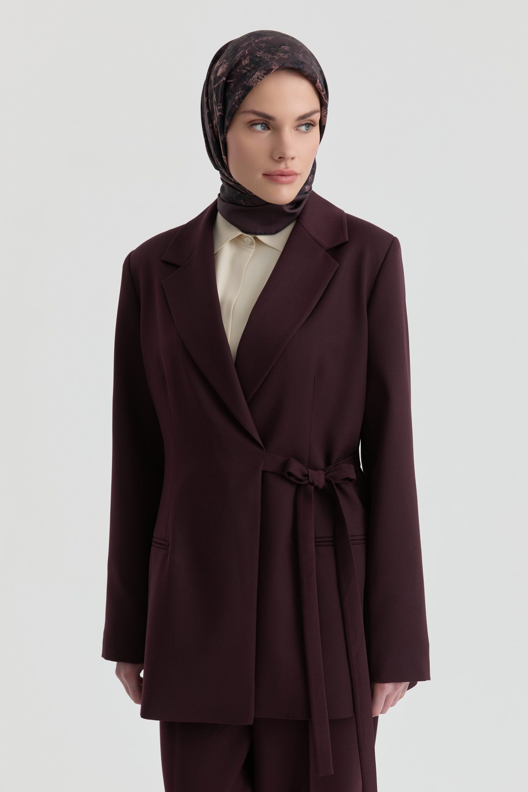 Tags: asymmetrical design, blazer, burgundy jacket, contemporary fashion, elegant jacket, side-tie jacket, women's outerwear