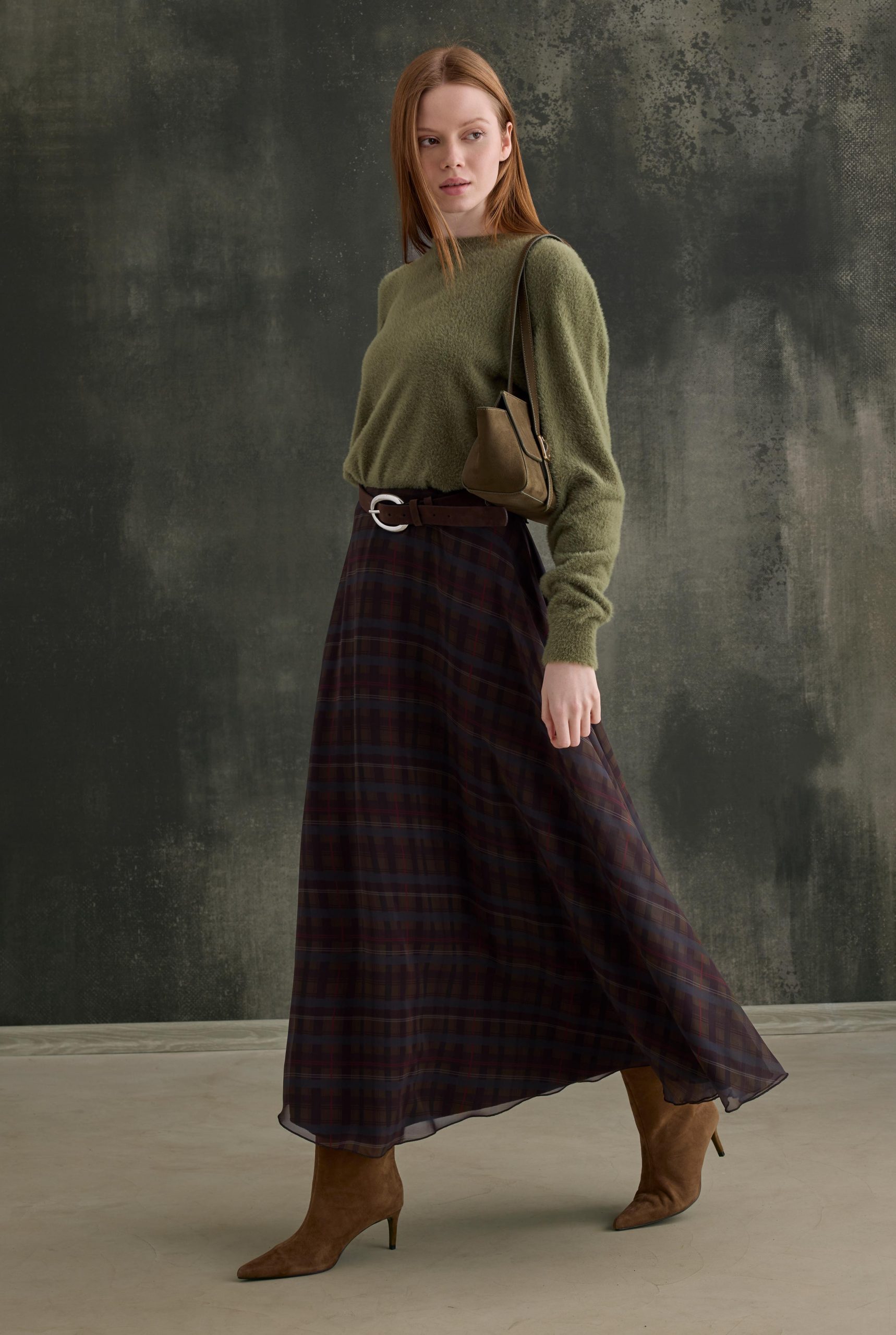 %100 polyester kumaştan üretilen bu şifon ekose etek, özel baskı desenlerin netliğini ve kalıcılığını korumak amacıyla polyester içerikle tasarlanmıştır. Polyester kumaş, baskının canlılığını ve desenlerin keskinliğini uzun süre muhafaza ederken; hafif yapısıyla eteğin akışkan formunu destekler. Ekose desenler, koleksiyon bütünlüğü gözetilerek özel olarak çizilmiş ve tasarıma karakteristik bir kimlik kazandırmıştır. Şifon dokunun hafifliğiyle ekose desenin klasik duruşunu bir araya getiren bu model, dökümlü yapısıyla zarif ve feminen bir siluet sunar. Hareket ettikçe akışkan formu ön plana çıkarak dinamik ve şık bir görünüm oluşturur. Günlük kombinlerde basic parçalarla dengelenebileceği gibi, daha özenli ve şık stillerde de rahatlıkla tercih edilebilir. Zamansız deseni ve hafif yapısıyla çok yönlü bir kullanım sunar. Bakım önerisi: Hassas yıkama yapınız. Ağartıcı kullanmayınız. Düşük ısıda ütüleyiniz. Boy: 95 cm (Ürün boyu üretimler arası 1-3 cm değişebilir.) Kalıp Bilgisi: Bel Basen 36 Beden: 74 cm 126 cm 38 Beden: 78 cm 130 cm 40 Beden: 82 cm 134 cm 42 Beden: 86 cm 138 cm Manken Ölçüleri: Boy: 174 cm Göğüs: 83 cm Bel: 62 cm Basen: 92 cm Mankenin Üzerindeki Beden: 36