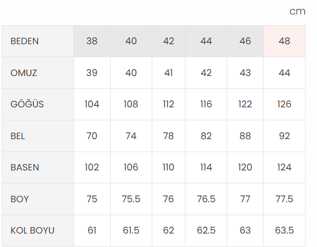 Size Chart: {‘unit’: ‘cm’, ’38’: {‘shoulder’: 39, ‘bust’: 104, ‘waist’: 70, ‘hips’: 102, ‘length’: 75, ‘sleeve_length’: 61}, ’40’: {‘shoulder’: 40, ‘bust’: 108, ‘waist’: 74, ‘hips’: 106, ‘length’: 75.5, ‘sleeve_length’: 61.5}, ’42’: {‘shoulder’: 41, ‘bust’: 112, ‘waist’: 78, ‘hips’: 110, ‘length’: 76, ‘sleeve_length’: 62}, ’44’: {‘shoulder’: 42, ‘bust’: 116, ‘waist’: 82, ‘hips’: 114, ‘length’: 76.5, ‘sleeve_length’: 62.5}, ’46’: {‘shoulder’: 43, ‘bust’: 122, ‘waist’: 88, ‘hips’: 120, ‘length’: 77, ‘sleeve_length’: 63}, ’48’: {‘shoulder’: 44, ‘bust’: 126, ‘waist’: 92, ‘hips’: 124, ‘length’: 77.5, ‘sleeve_length’: 63.5}}