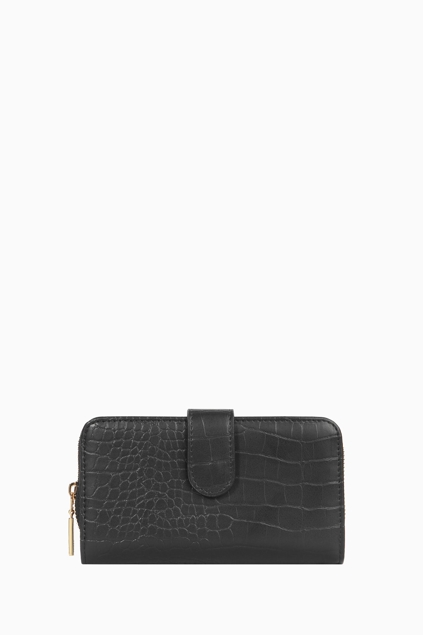This wallet features a standout crocodile-pattern leather surface, offering secure and practical use with its snap-closure detail.