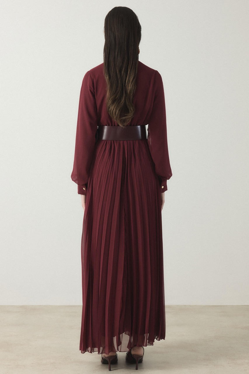 A stunning chiffon dress featuring a flowing skirt design in a rich burgundy hue. Perfect for elegant occasions, this piece combines comfort with sophisticated style.