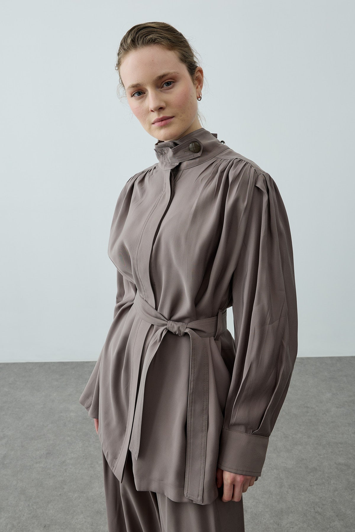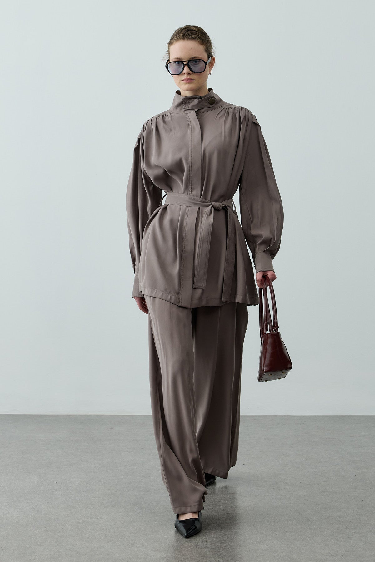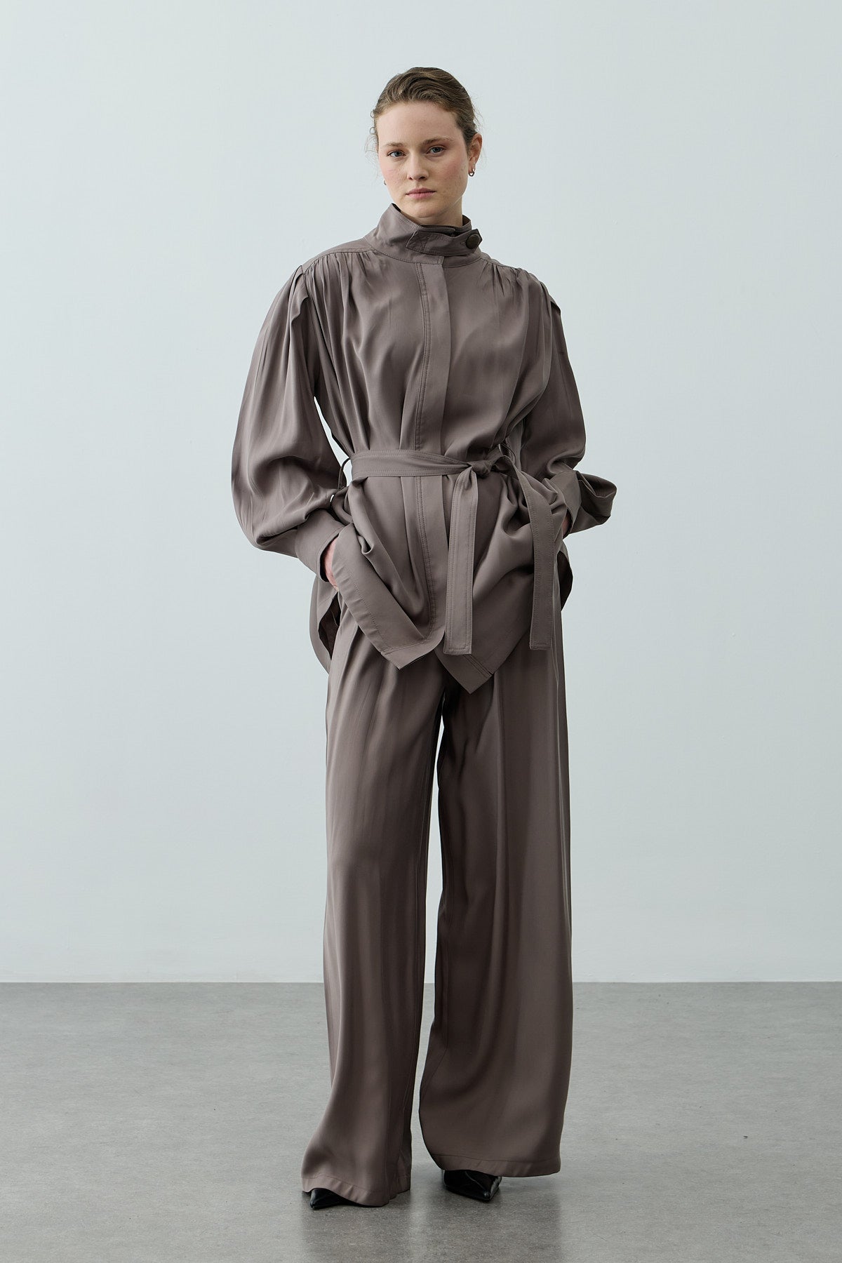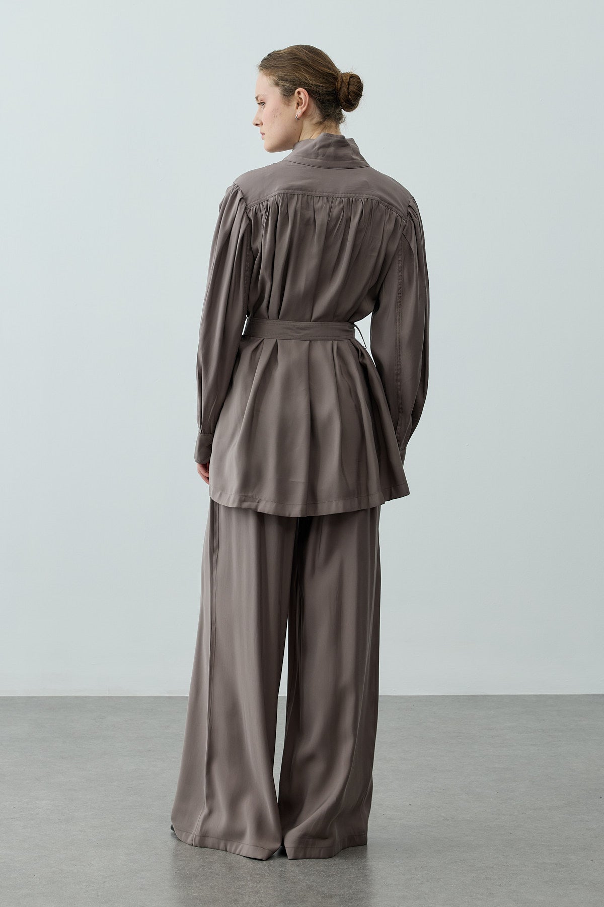 A set featuring a stand collar shirt with a button-front closure, long sleeves, cuffs, adjustable belt, and pockets, made from Tencel woven fabric. Paired with zip-front, button-closure, pleated, palazzo-cut trousers.