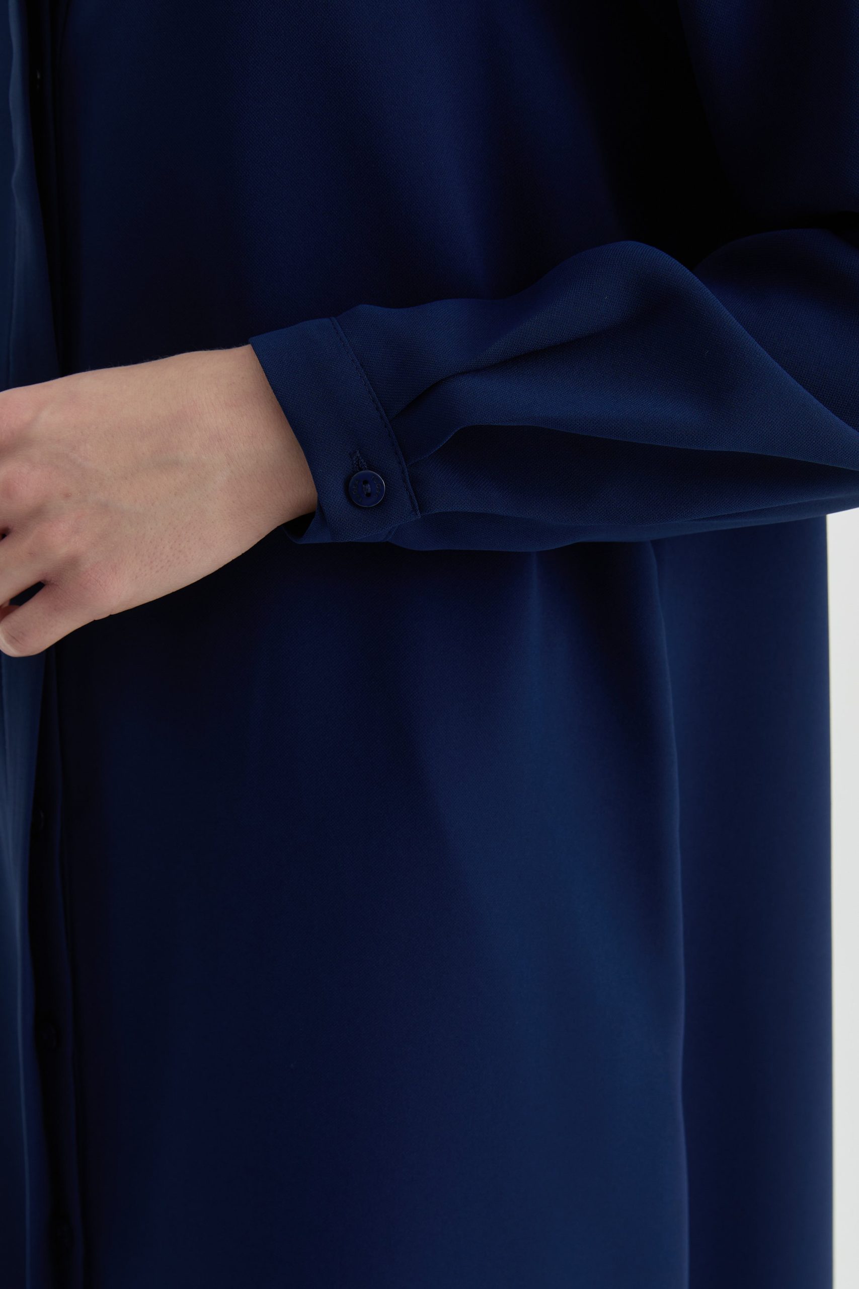 Tags: Chic, elegant, hidden slit, long sleeve, minimalist, navy blue, polyester, stand collar, tunic