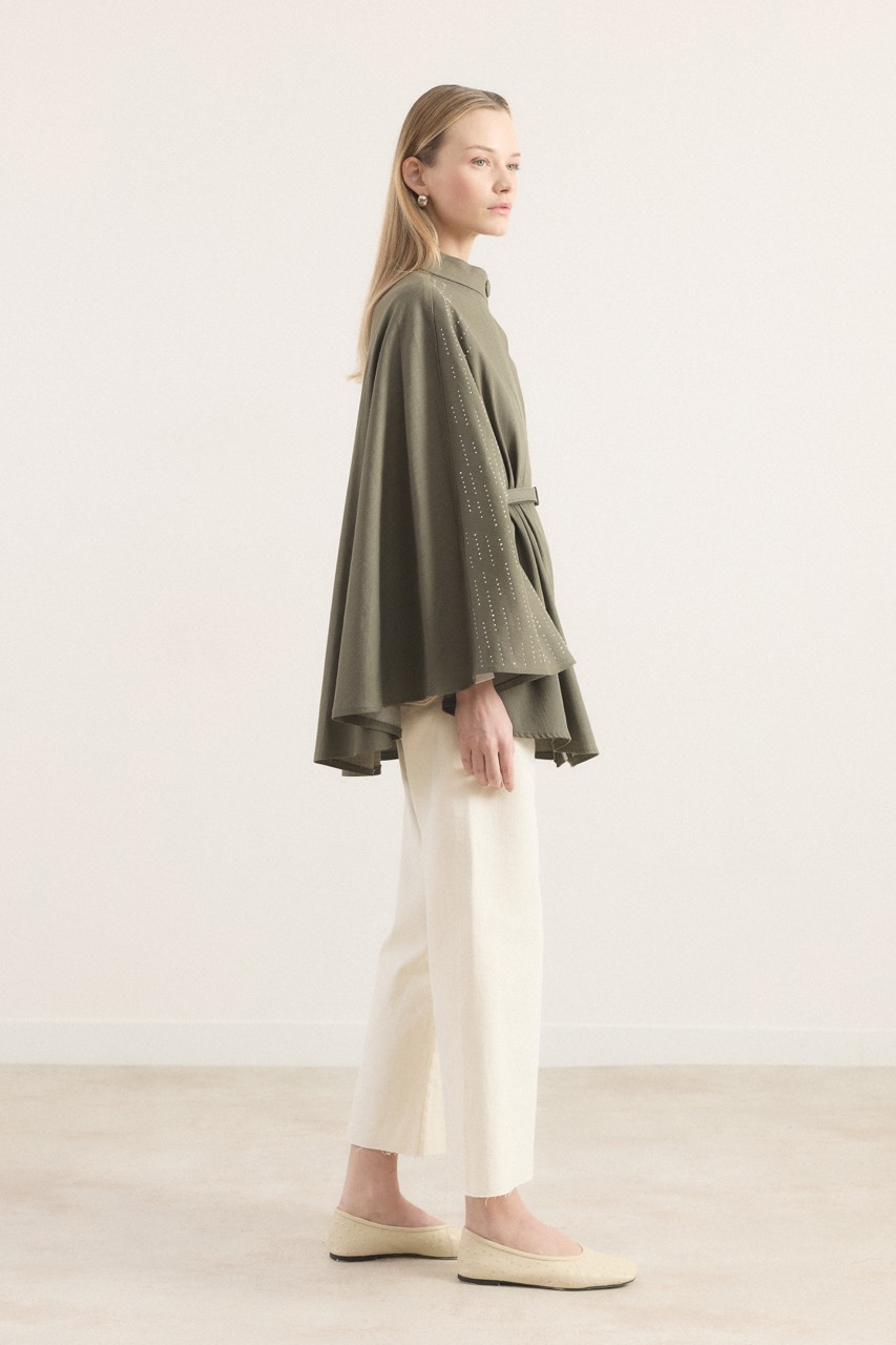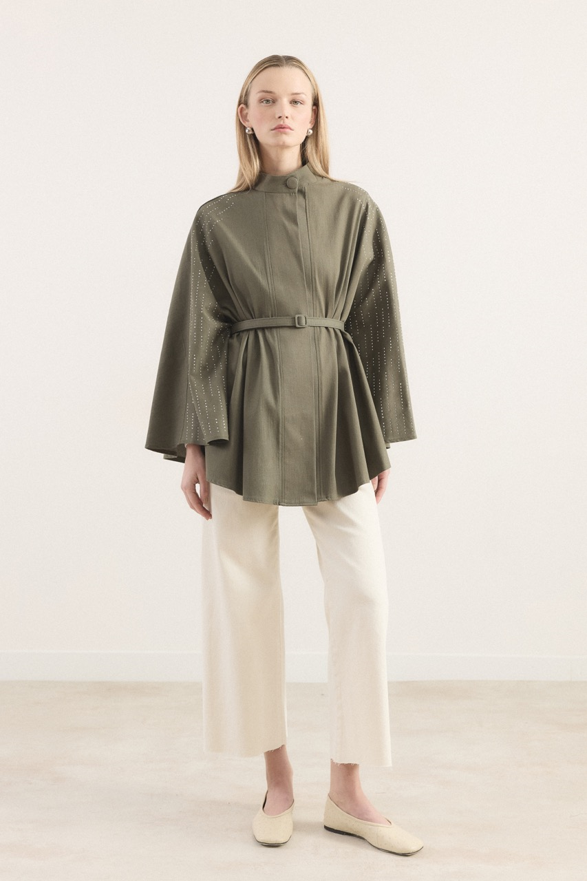 Stone-Embellished Denim Poncho – Khaki
