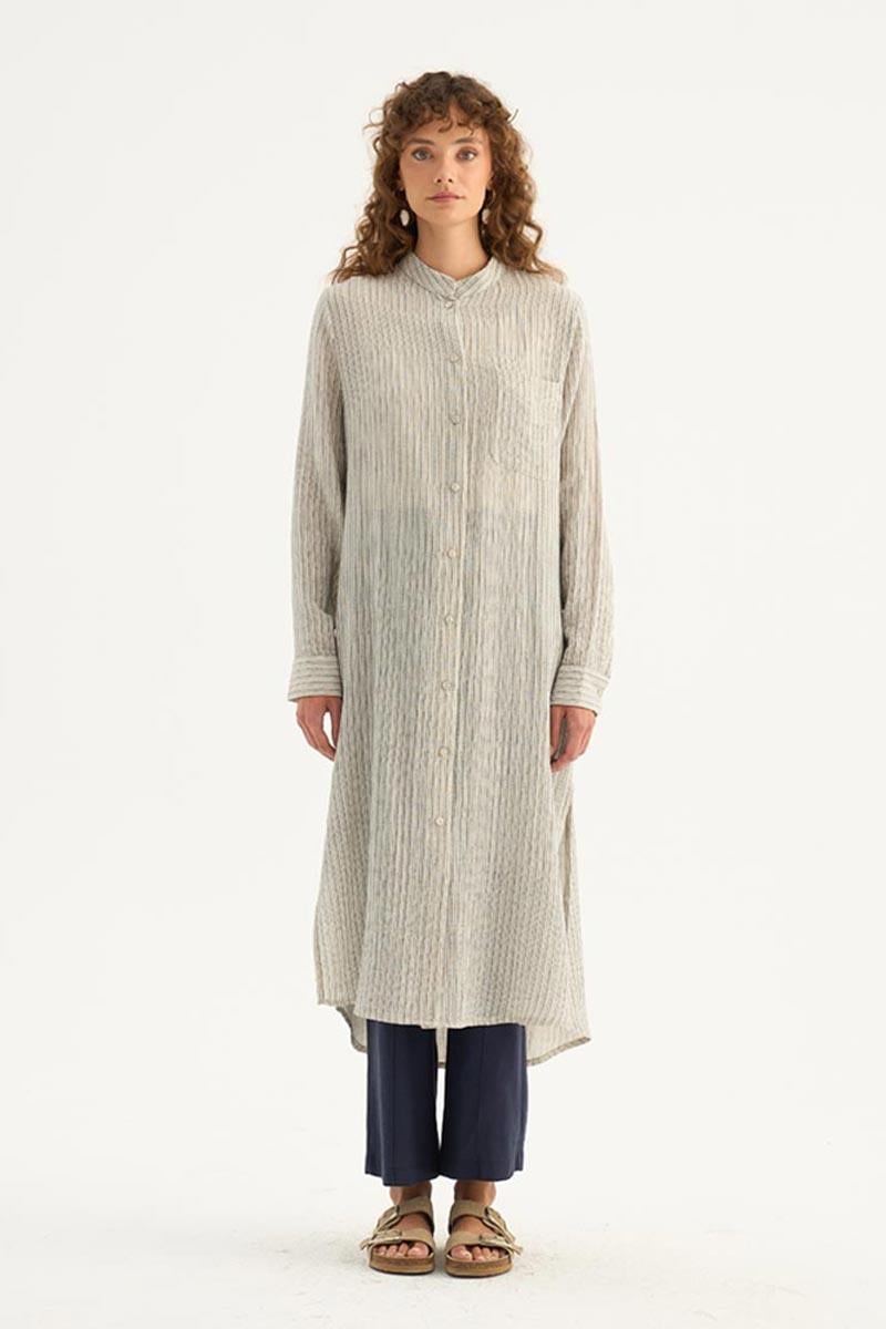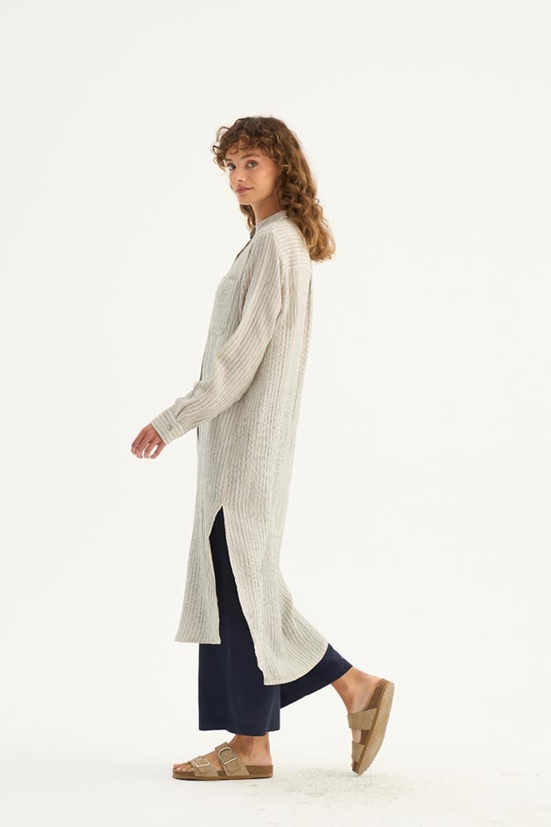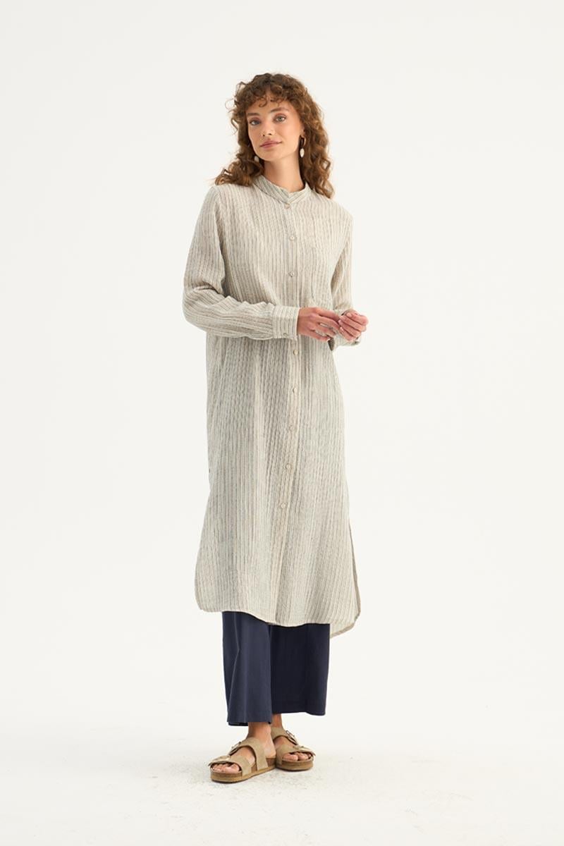 Tags: cotton clothing, ecru top, long sleeve tunic, muslin top, striped tunic, summer dress, women's fashion