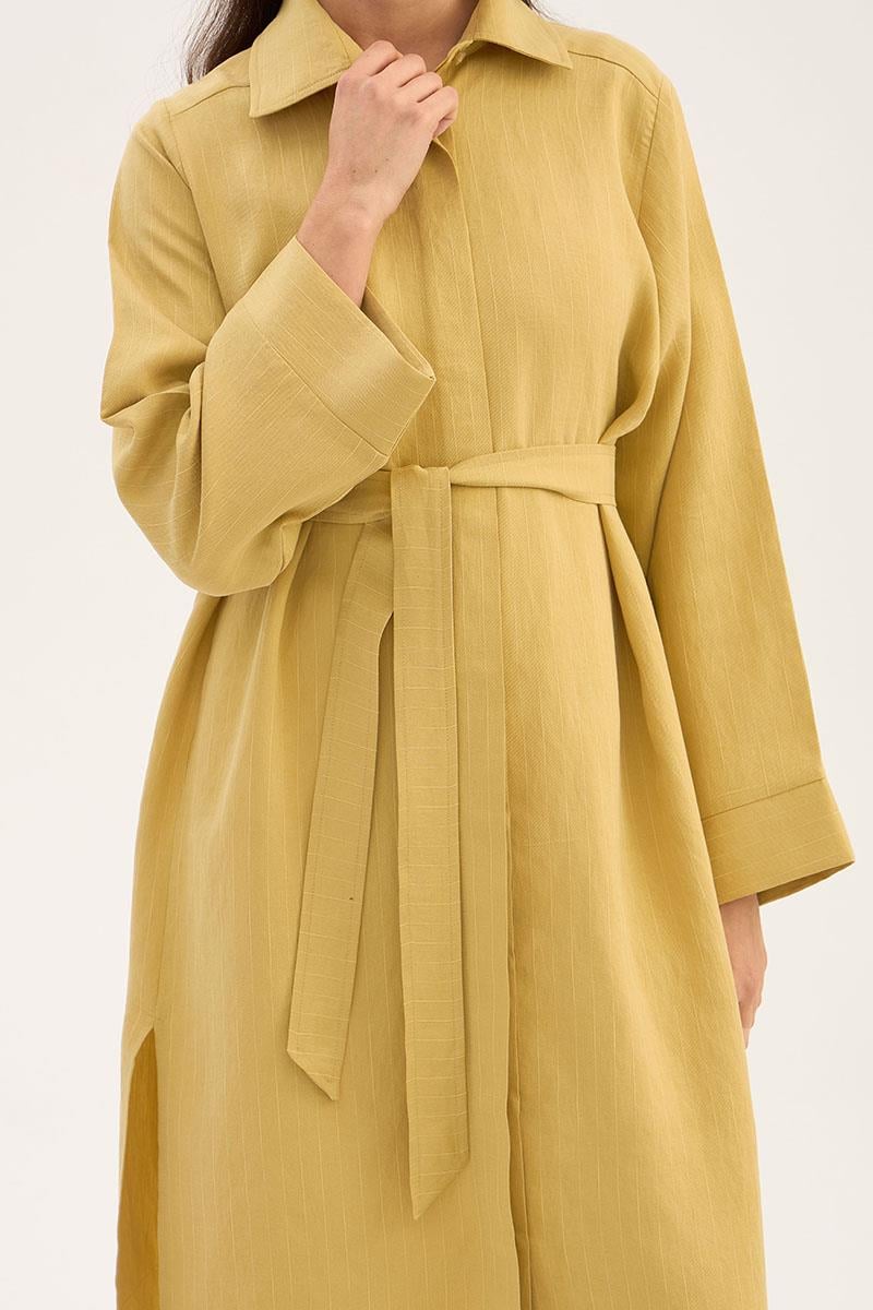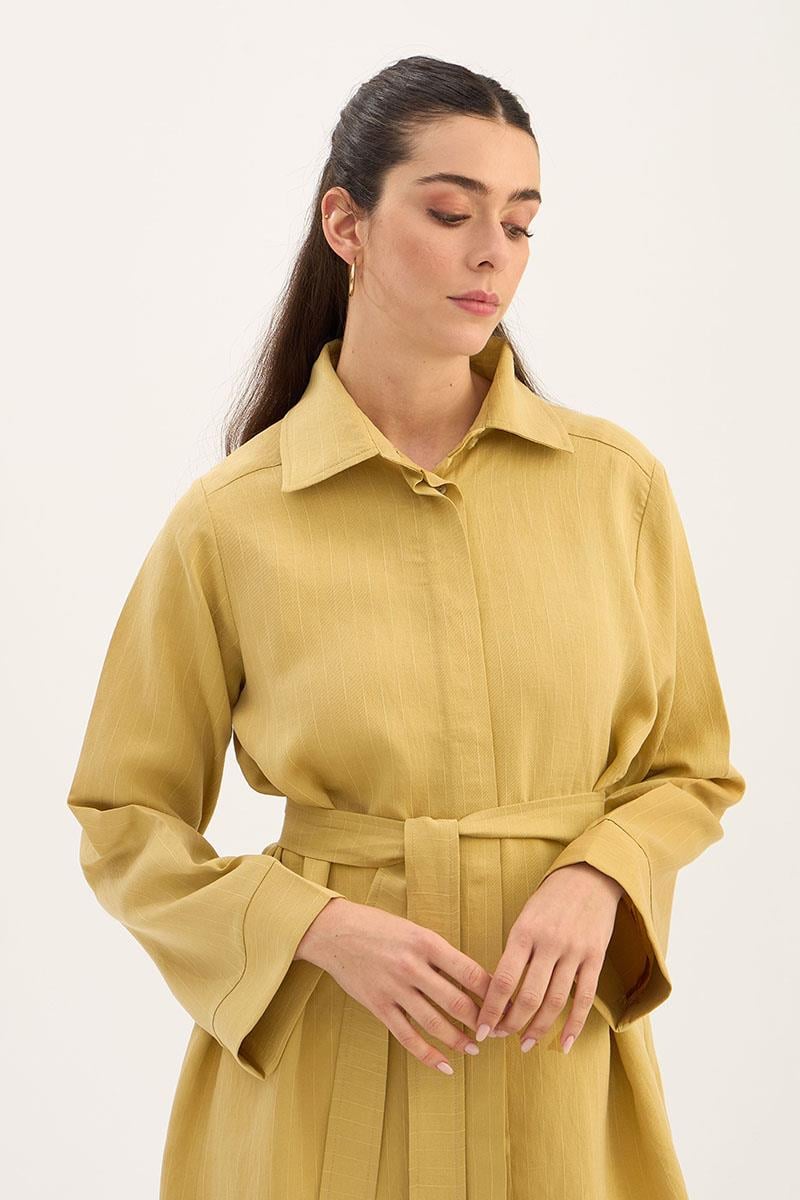 This lemon green long tunic, featuring natural texture and elegant stripes, is one of the fresh and stylish pieces for the summer season. Made from 88% Tencel and 12% PES blend, the fabric offers lightness and softness while its breathable structure ensures comfort in warm weather. The fine striped texture provides a modern look, while the self-fabric belt detail at the waist creates a flattering, body-conscious silhouette. With its wide-cuffed long sleeves and side slits, this tunic offers freedom of movement and works perfectly for both daily wear and special occasion outfits. It pairs easily with trousers, skinny leggings, or long skirts. The delicate lemon green shade harmonizes beautifully with pastel and neutral colors, adding a romantic touch to your style.