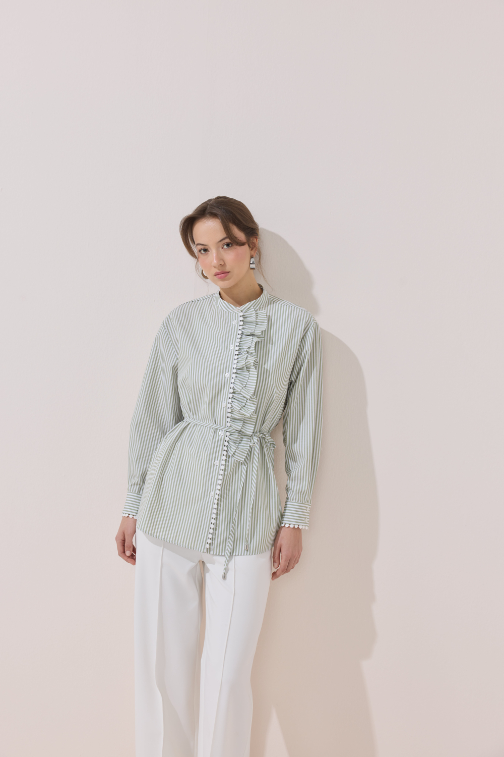 Striped shirt with ruffle and fisto detailing. Features a slim belt at the waist. Made of 100% cotton. Measurements for size 2: Chest 116 cm, Waist 116 cm, Hips 120 cm, Length 75 cm. Sizes available: 1 (36-38), 2 (38-40), 3 (40-42), 4 (42-44). Model’s measurements: Height: 177 cm, Chest: 90 cm, Waist: 62 cm, Hips: 93 cm. Model wears size 2.