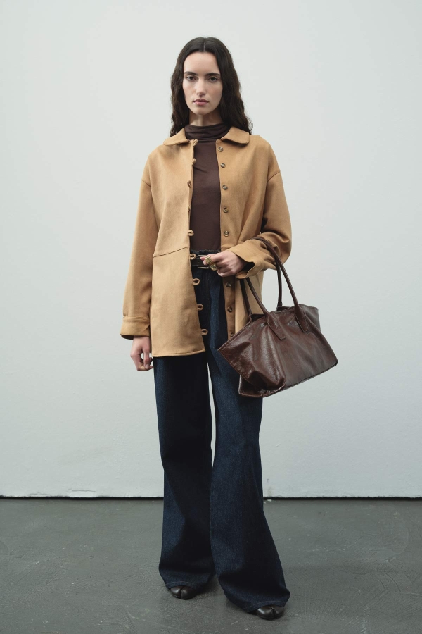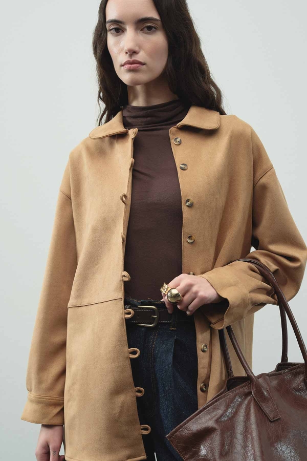 Tags: button detail, camel, dry clean only, fashion shirt, suede shirt