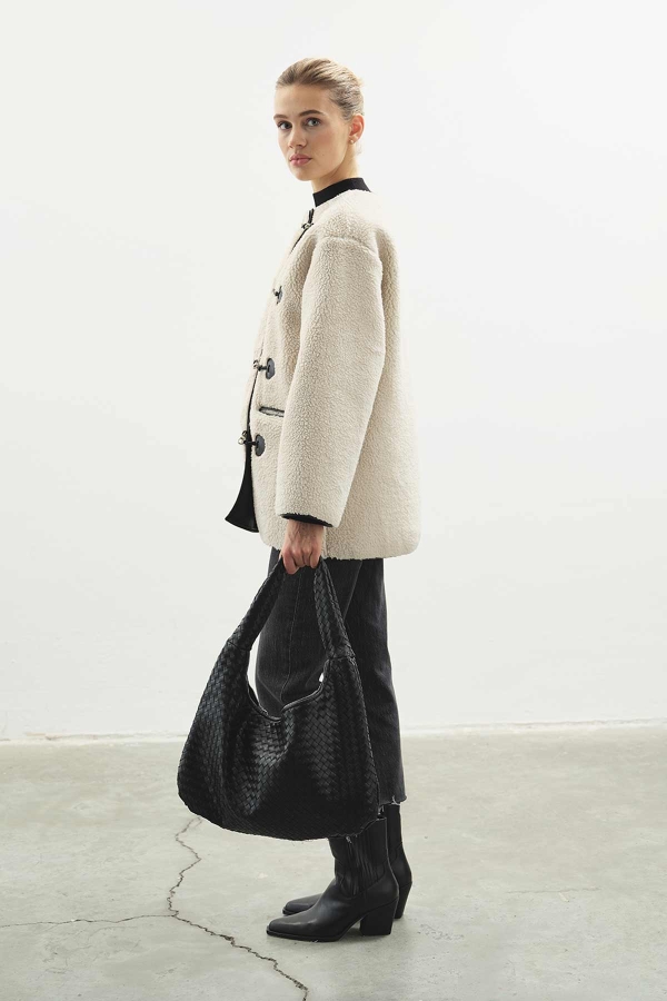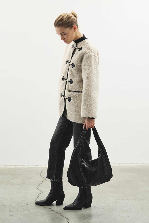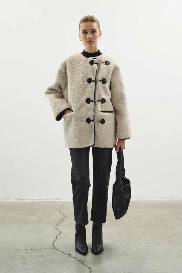 TEDY LEATHER STONE COAT FEATURES: Biker collar, metal buckle closure, leather-lined interior, pocketed, includes optional detachable pouch (carefully open to activate), regular fit, unlined tedy leather coat. CONTENT AND CARE: 100% Polyester. Dry cleaning recommended. Hand measurements may vary by 2-3 cm. Model Size: S-M. Model Measurements: Height: 177 cm, Bust: 77 cm, Waist: 61 cm, Hips: 89 cm