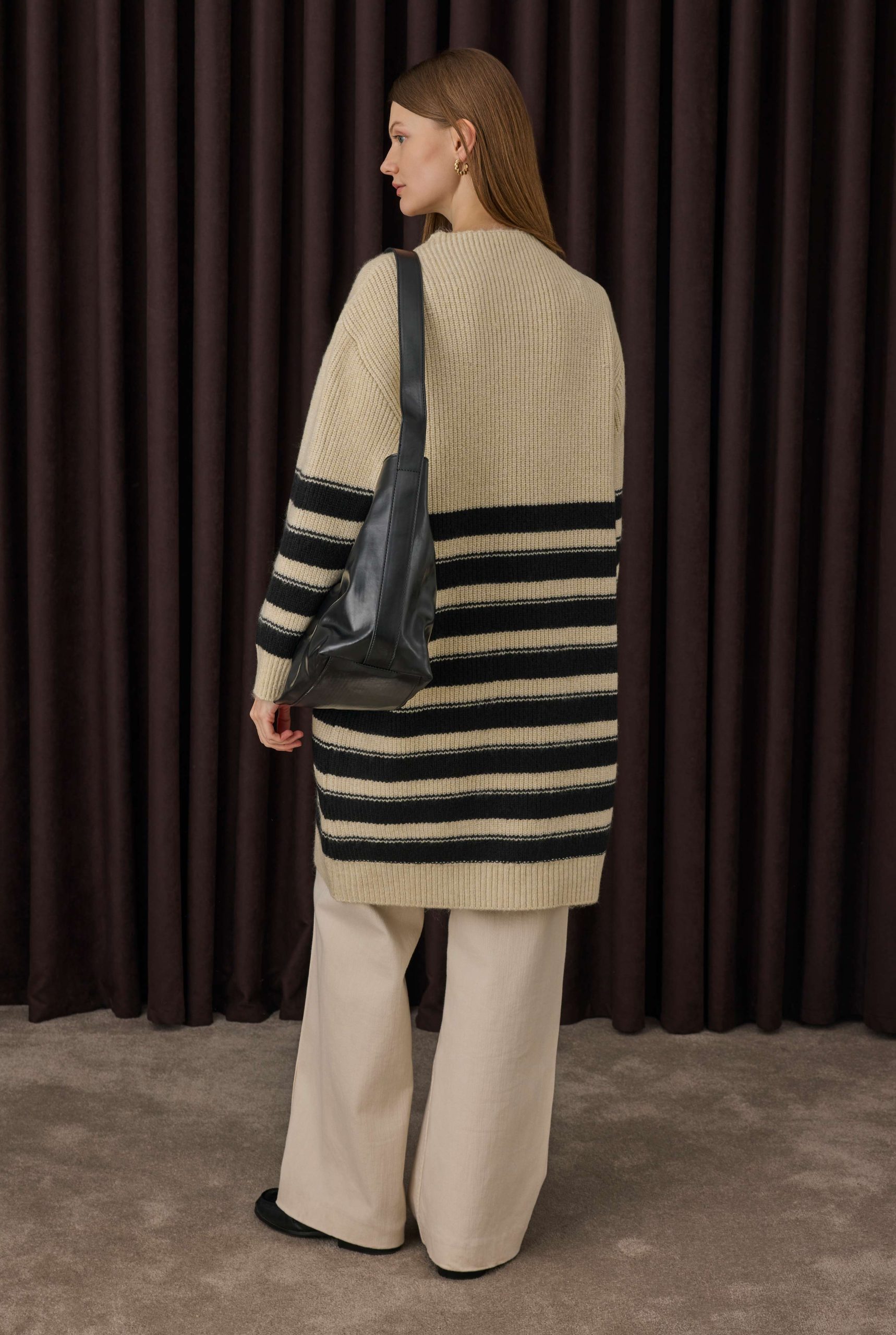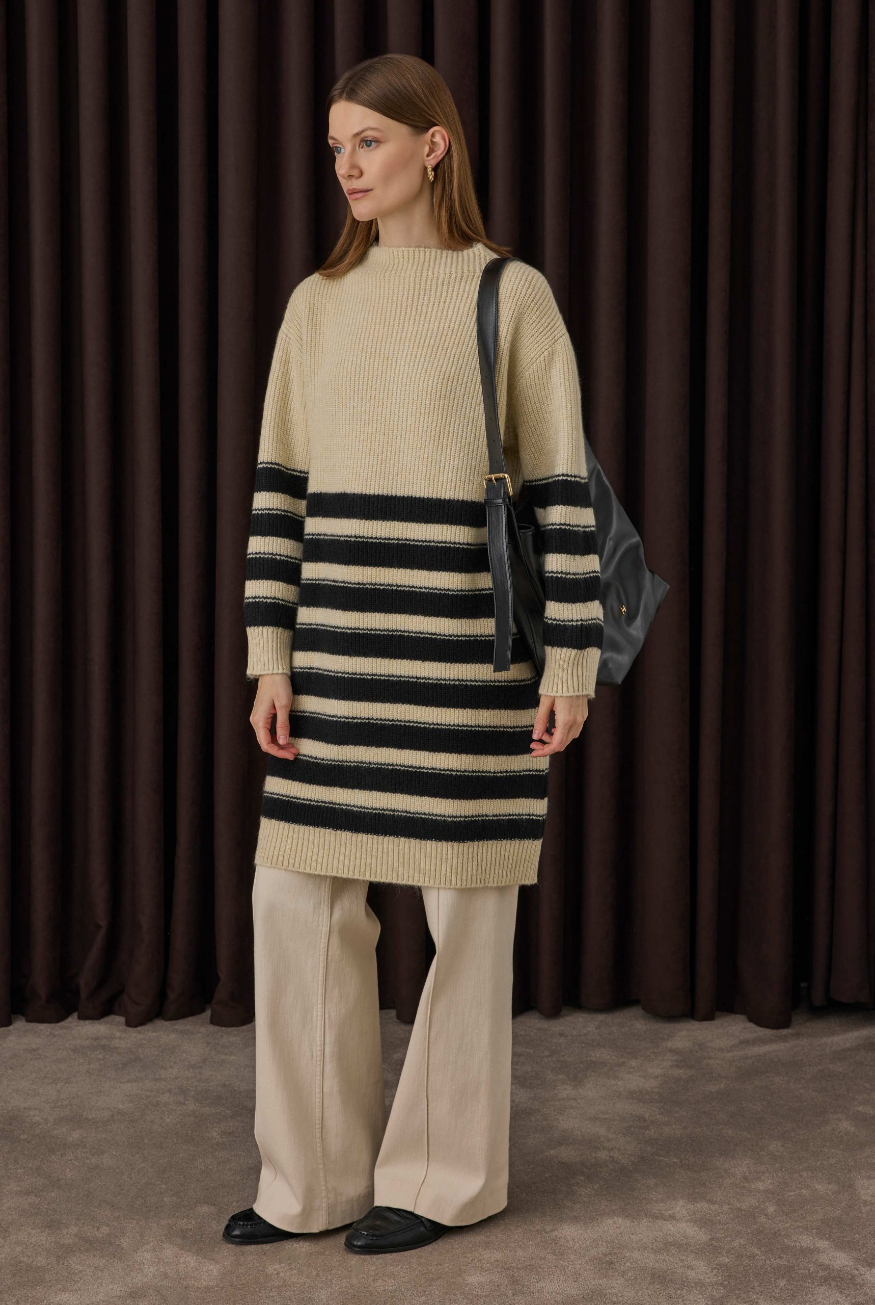 With its modern lines, the thin striped long sweater combines comfort and style through its ribbed collar detail. The long silhouette allows for a comfortable and elegant look.