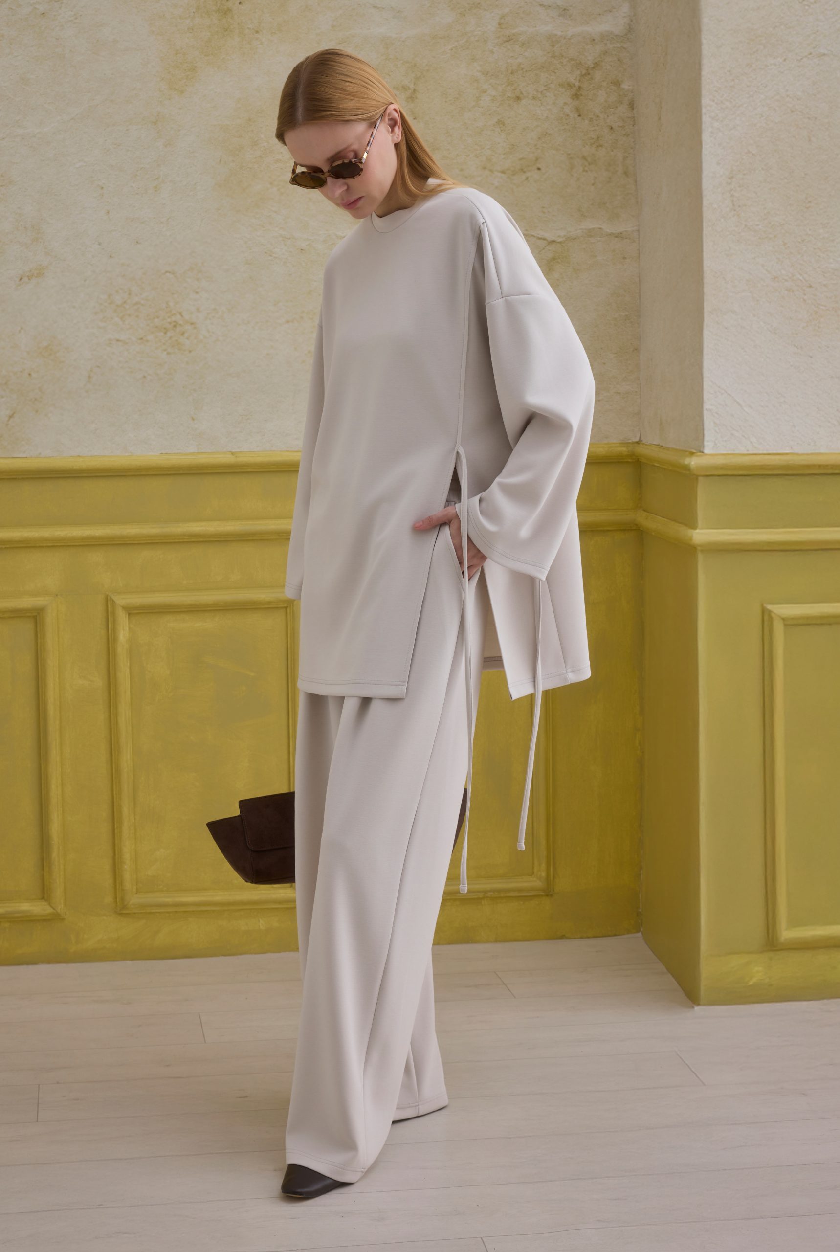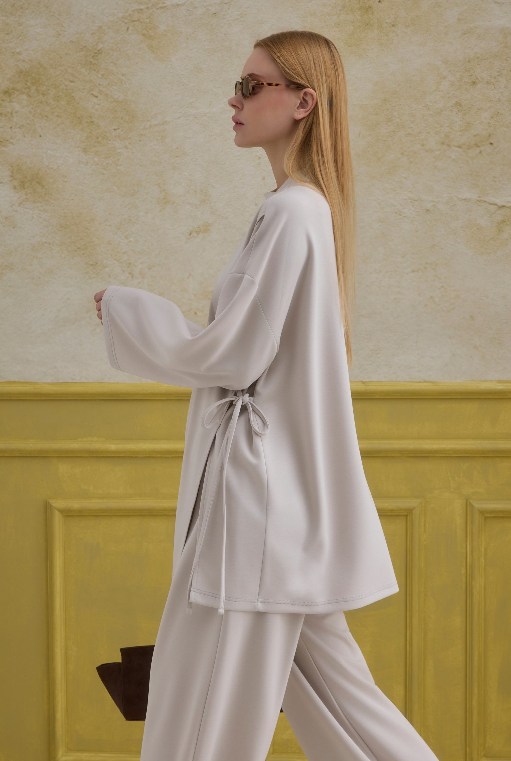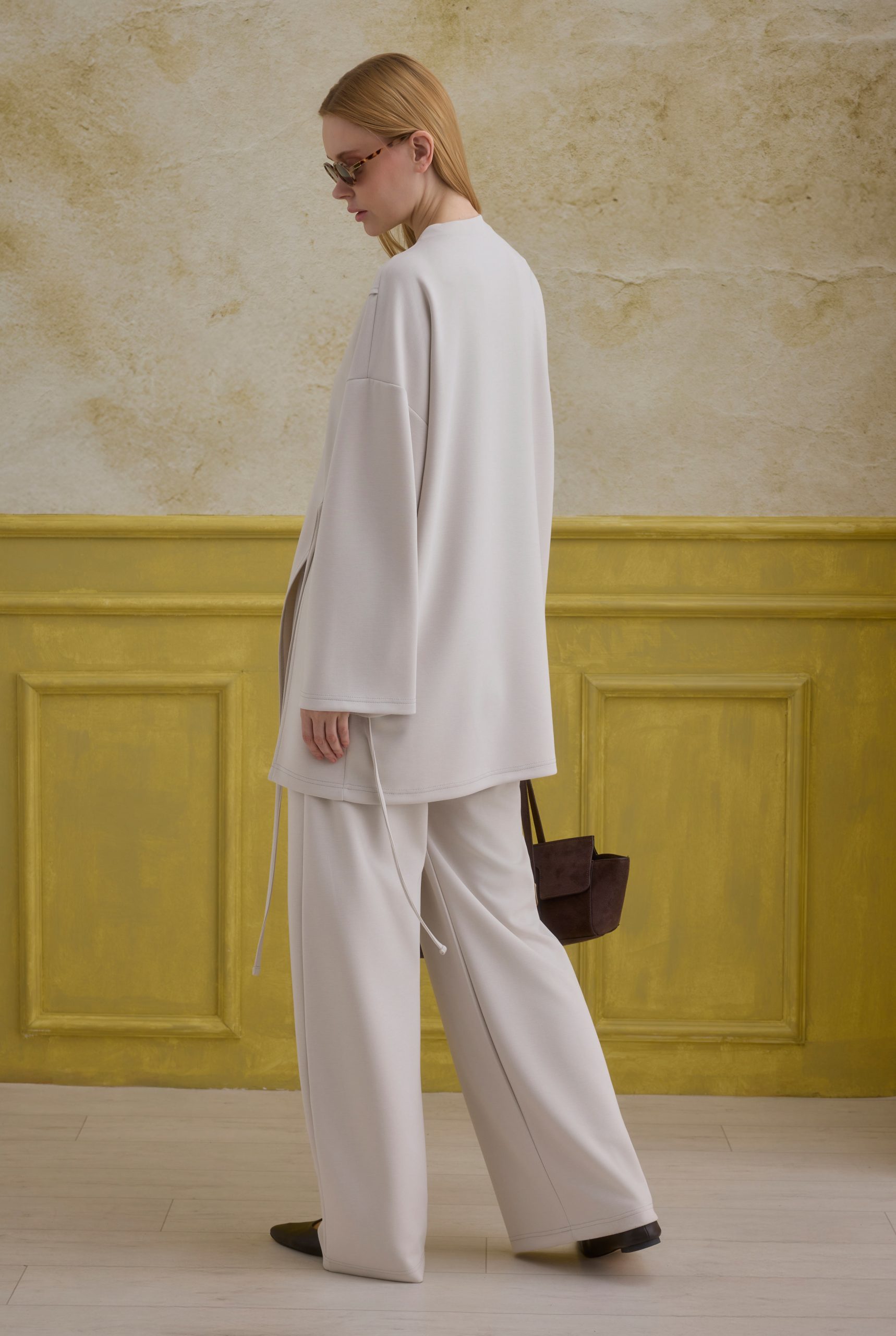 The tie detail adds a subtle yet stylish accent to the set, while the relaxed pleated trousers provide both freedom of movement and elegance. It becomes an essential choice for daily and sporty combinations. If desired, the side slit can be secured with hand stitching.