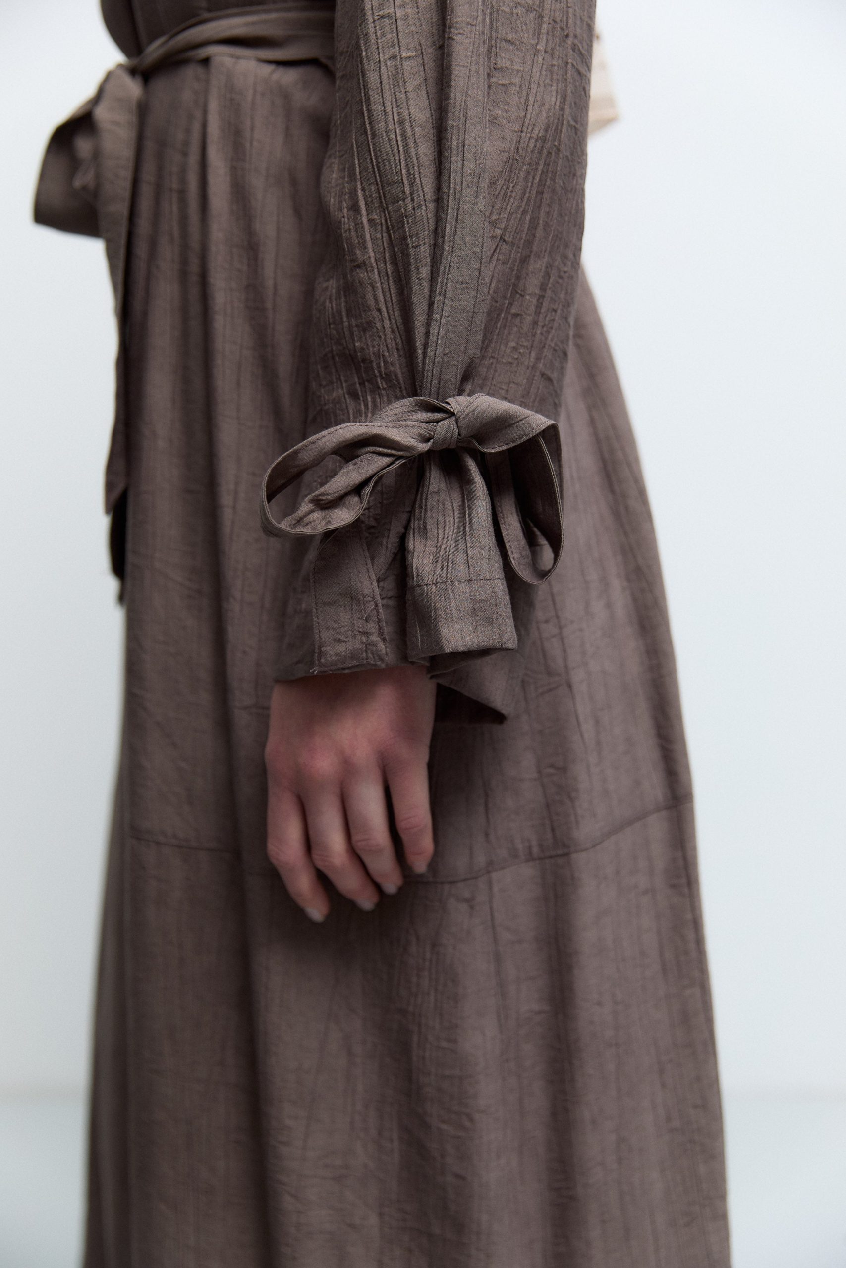 The Tie-Sleeve Detail Trench Coat is designed for those who wish to make a statement in outerwear, blending masculine cuts with feminine elegance.