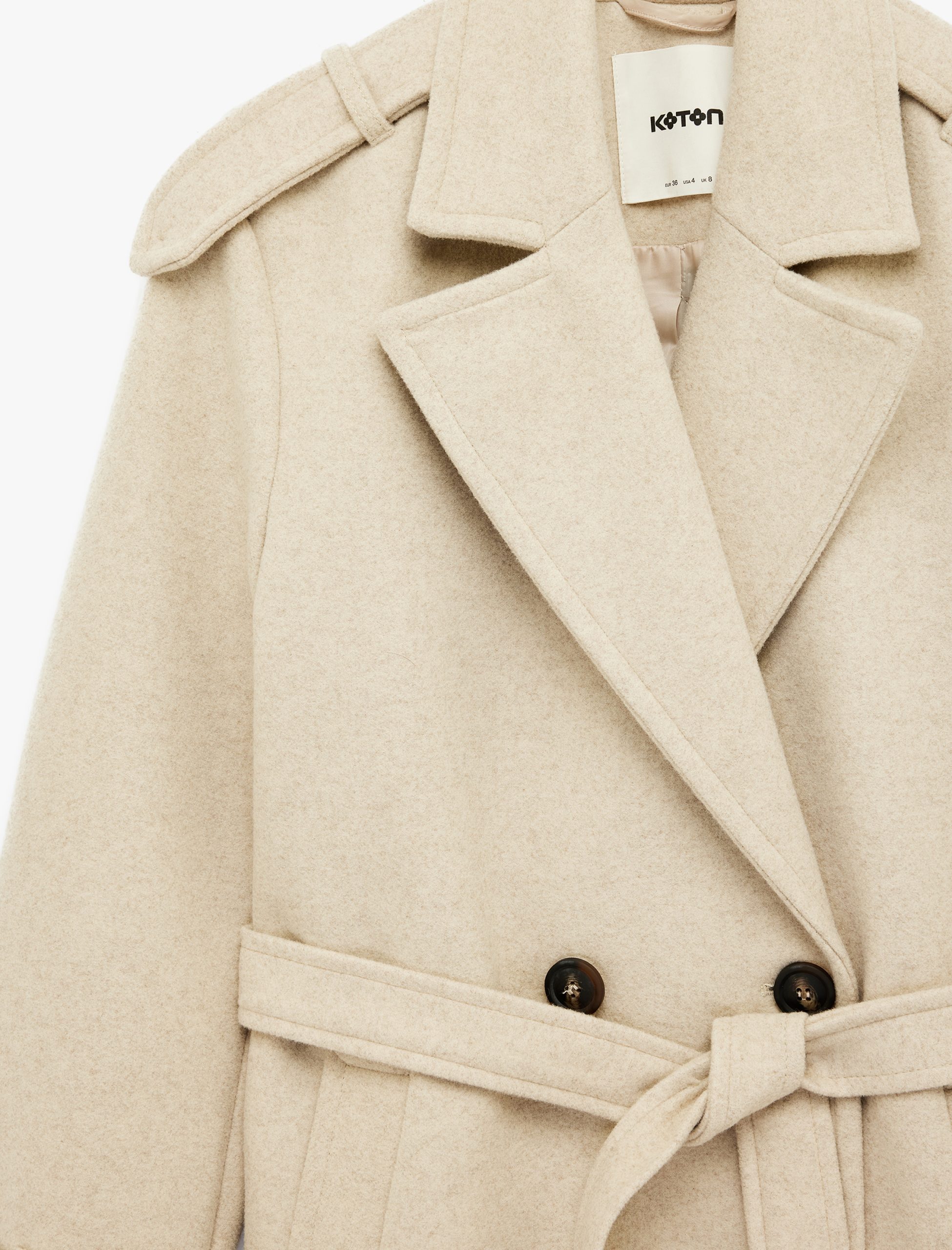 This long cashmere-like trench coat redefines classic elegance with its cross-over closure and belt detail. Featuring long sleeves and a low shoulder cut for comfortable wear, along with an inner lining for warmth and comfort. The double-pleated pocket design offers both practicality and style, making it suitable for both city life and special occasions. Style Suggestion: The long cashmere-like coat is an ideal choice for creating the most stylish winter outfits when paired with leather boots and plush scarves. You can achieve a sophisticated look by combining it with black or cream trousers and turtleneck sweaters. Complete your style with large shoulder bags and minimalist accessories to stand out in daily city life. Product Features: Sleeve Type: Long Sleeves; Detail: Belted, Double-Pleated Pockets; Fit: Regular; Usage Area: Daily Wear, Office Wear, Special Occasions. Don’t compromise your elegance on cold days with Koton’s graceful coat design. Explore the Koton coat collection now and breathe new life into your style! — Technical Details — Model Information: Height: 175 / Waist: 61 / Bust: 83 / Hips: 90; Sleeve Type: Long Sleeves; Detail: Belted, Double-Pleated Pockets; Fit: Regular; Usage Area: Daily Wear, Office Wear, Special Occasions; Collar Type: Cross-over collar; Silhouette: Cross-over; Product Type/Style: Cross-over; Product Sub-Brand: City fashion