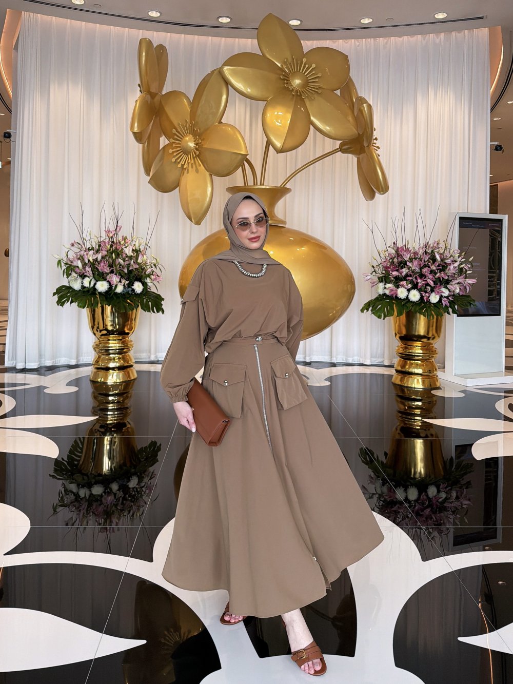 Tags: camel color, elastic waist, parachute fabric, skirt set, tunic, women's fashion, zipper detail