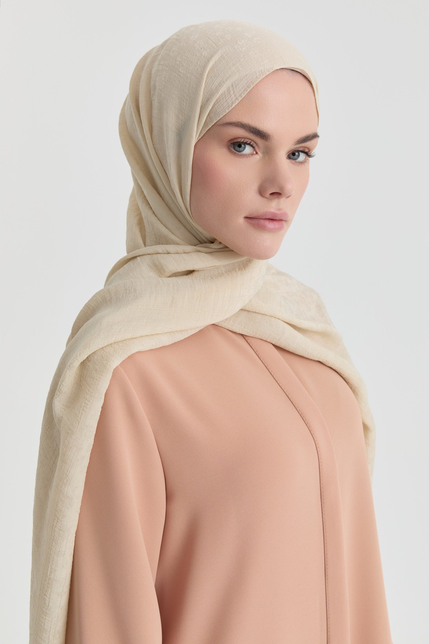 The Tülin Jacquard Shawl stands out with its soft texture and fine jacquard craftsmanship, blending simple elegance with delicate details. The slight movement created by the pattern on the surface gives the shawl both depth and a natural shimmer.