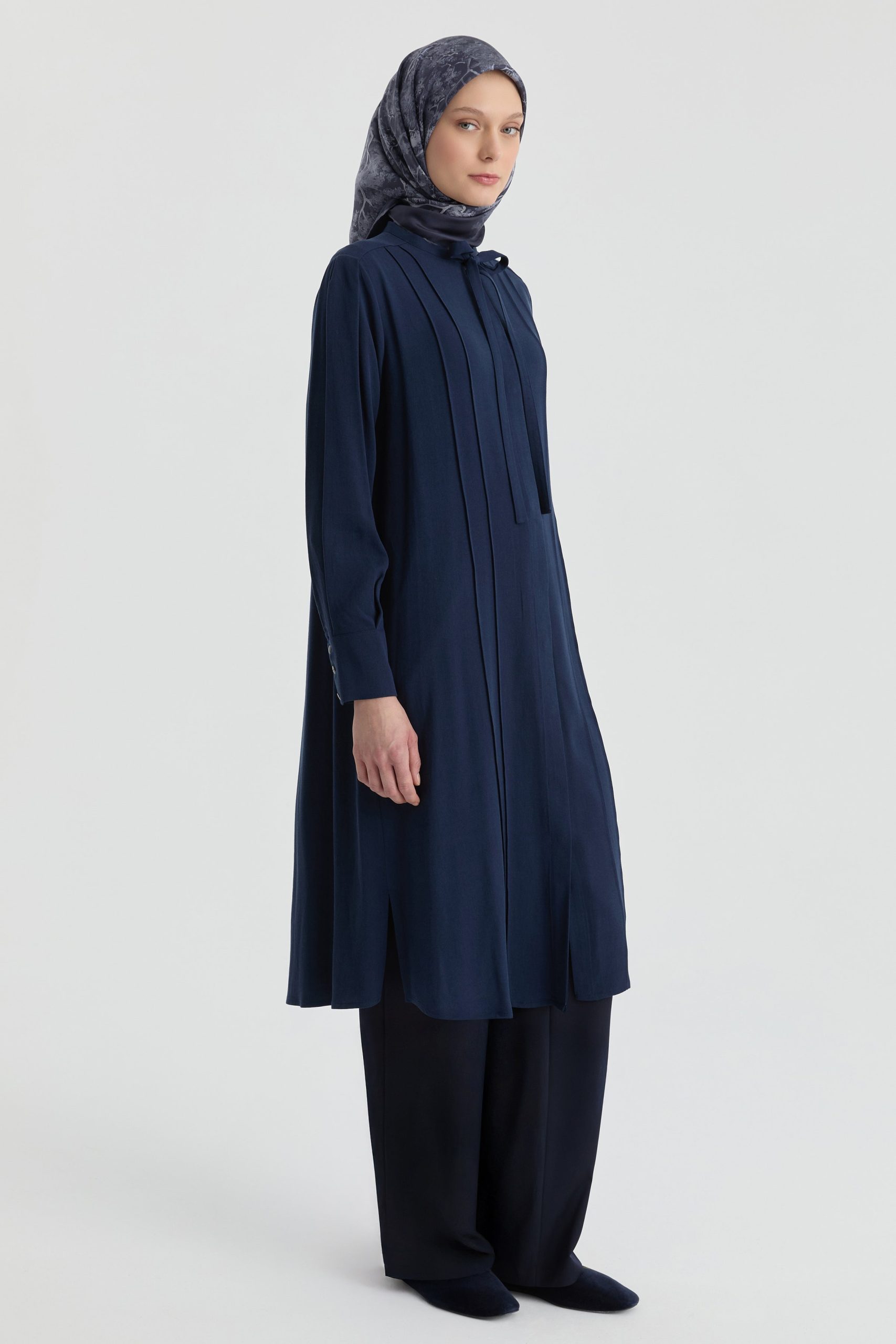 Tags: comfortable clothing, drawstring neckline, long sleeve, lyocell, navy blue, regular fit, scarf neck, tunic, women's fashion