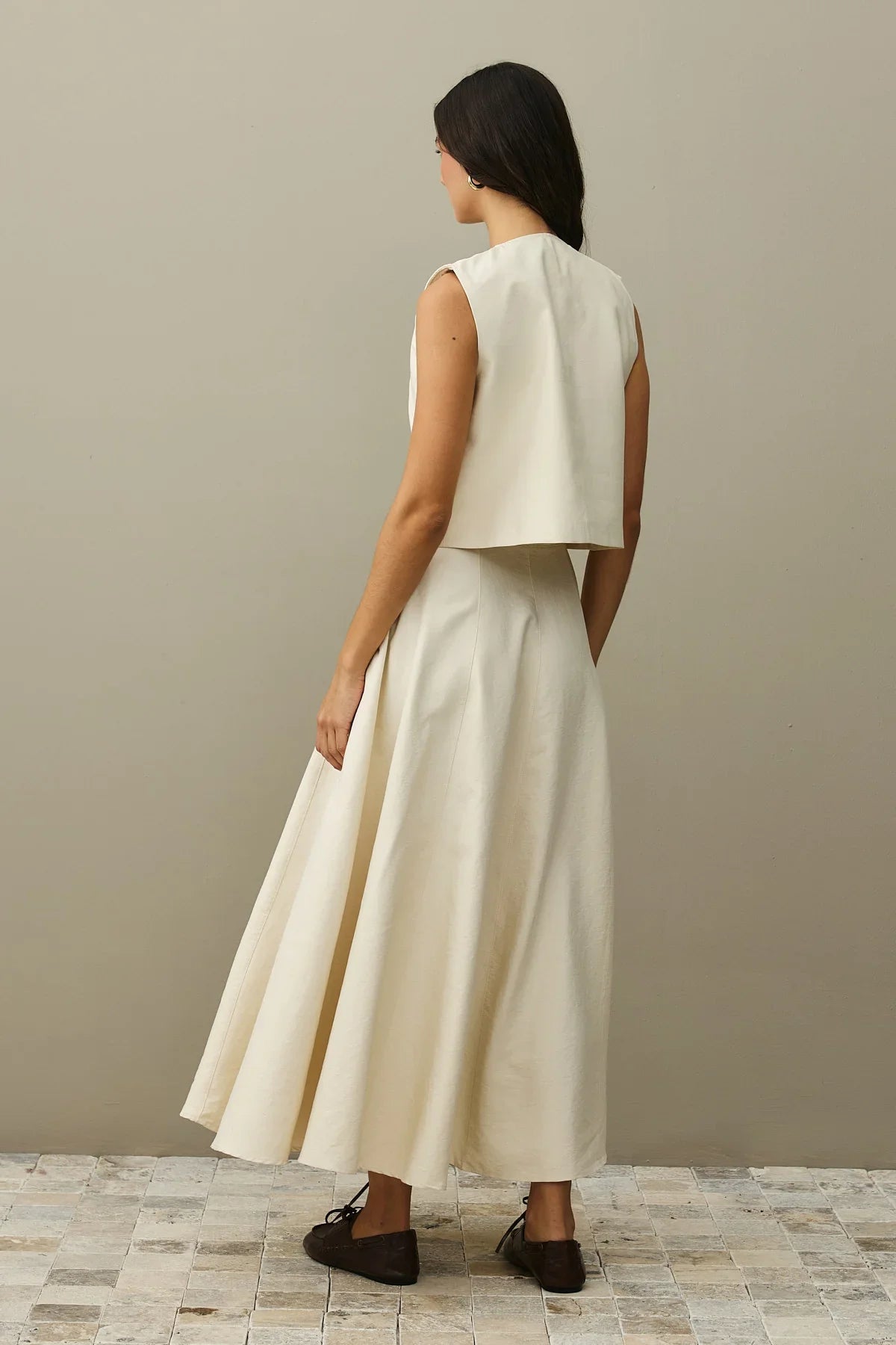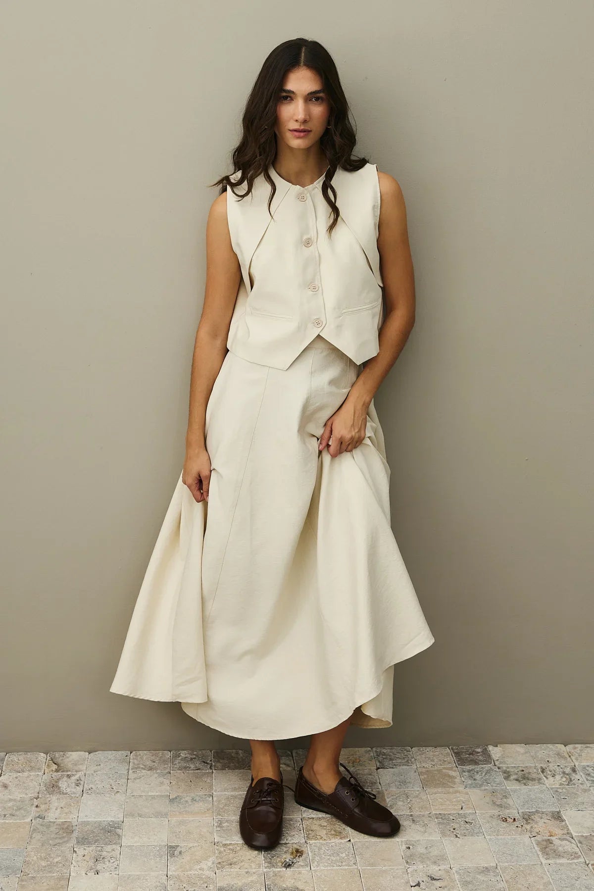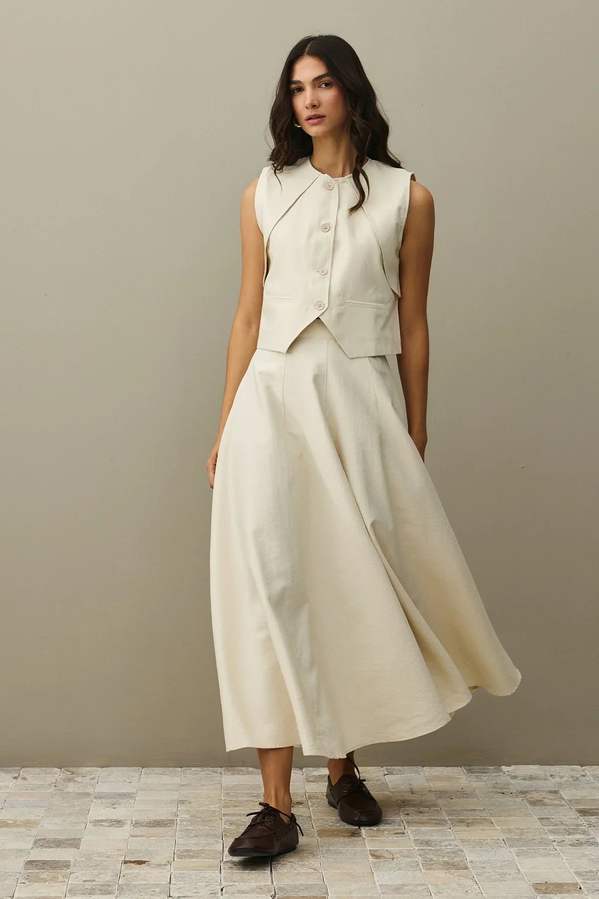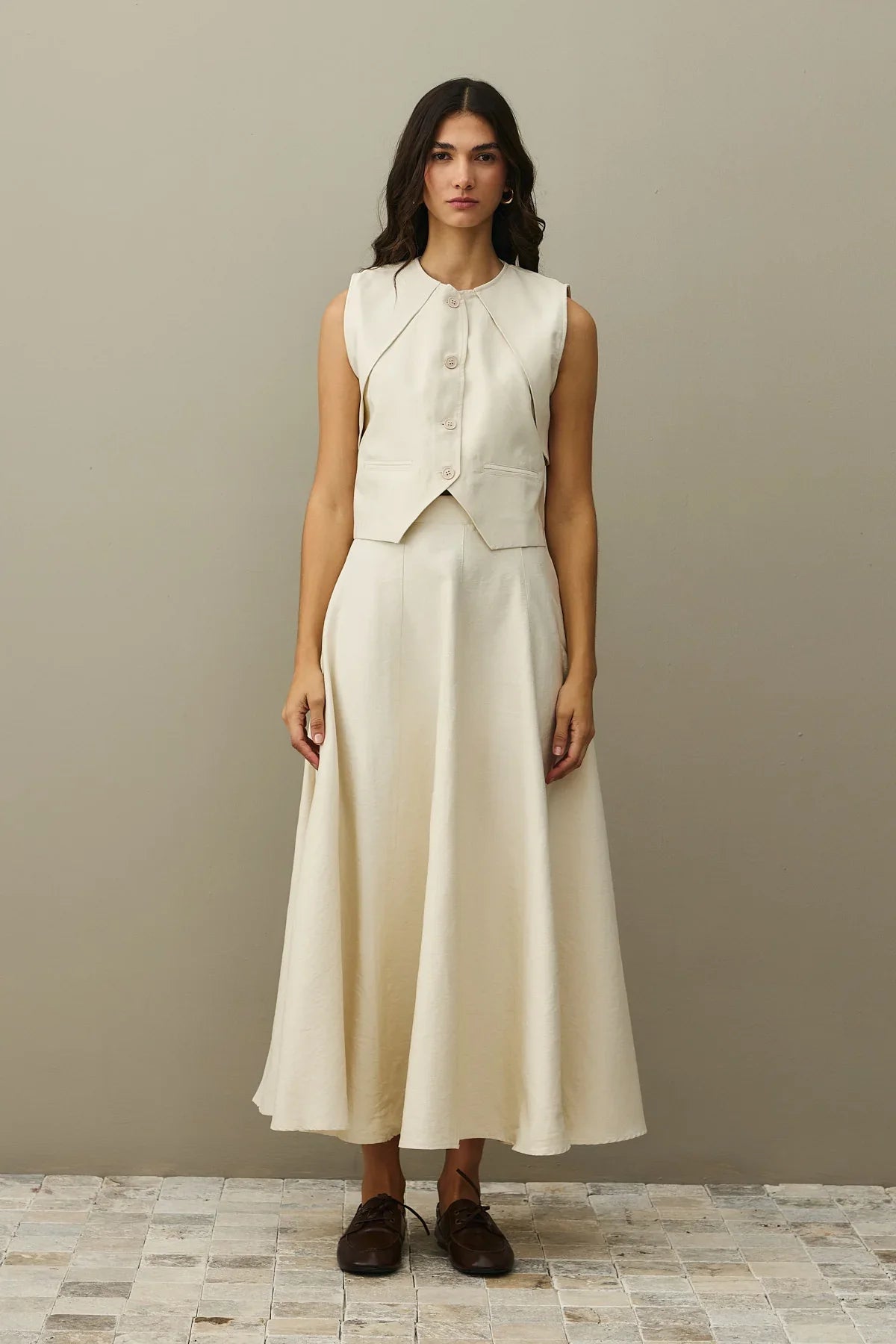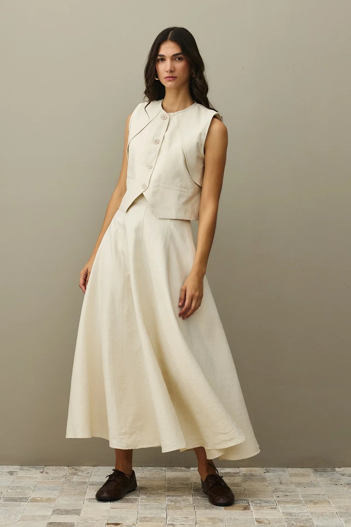 Crafted from textured woven fabric, this ensemble features a mandarin collar, button-front vest, and a flared maxi skirt with a zipper closure and paneled design.