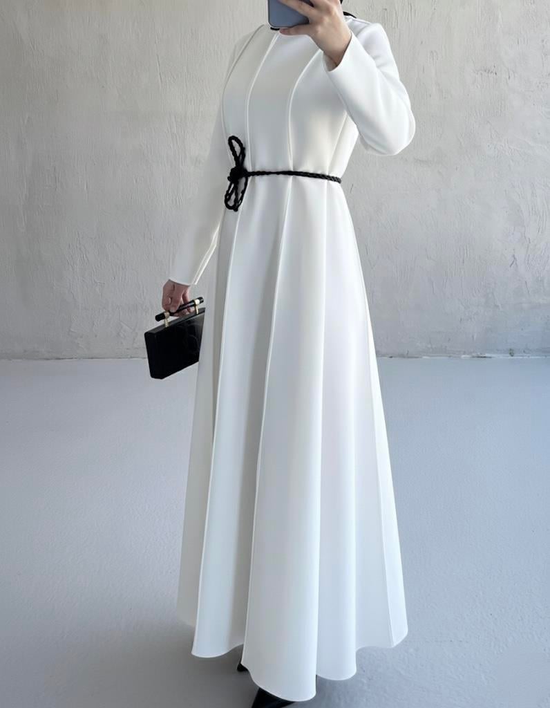 Cavin Pleated Waist Chain Satin Dress – Ecru