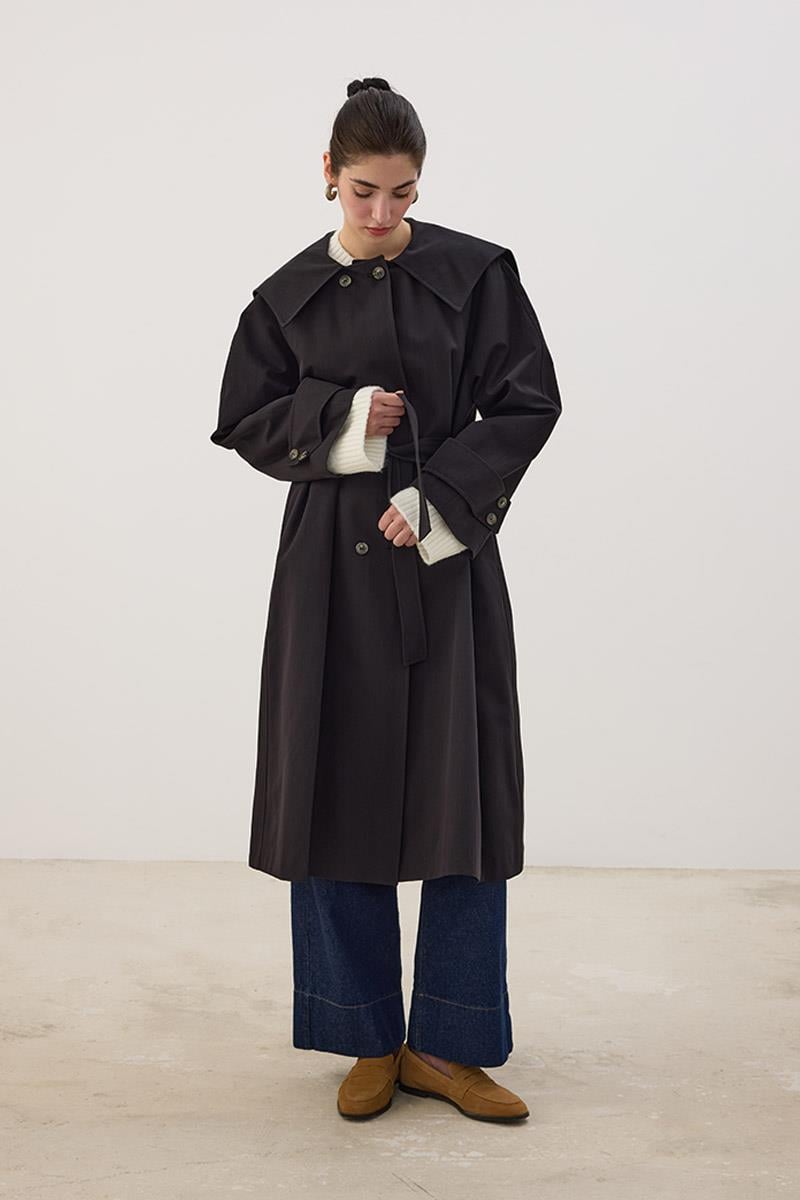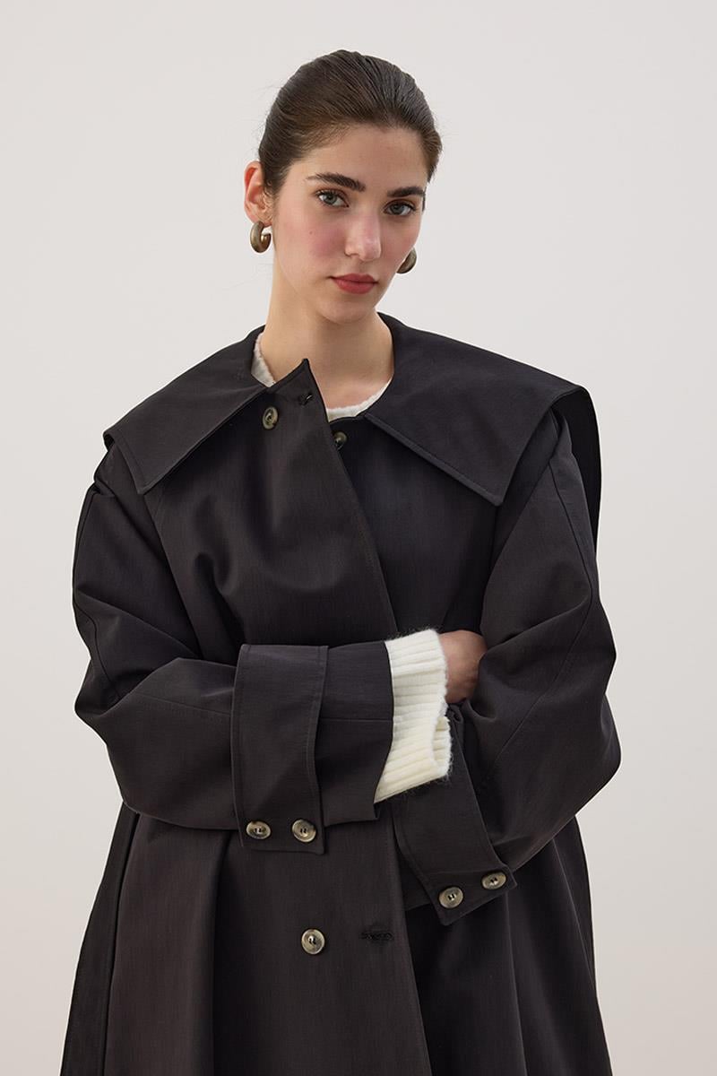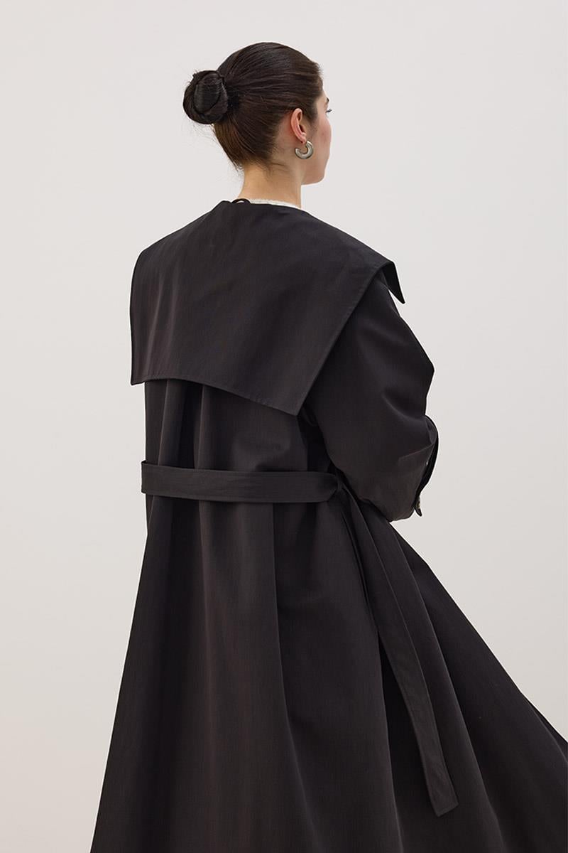 Wide Collar Long Trench Coat in Black