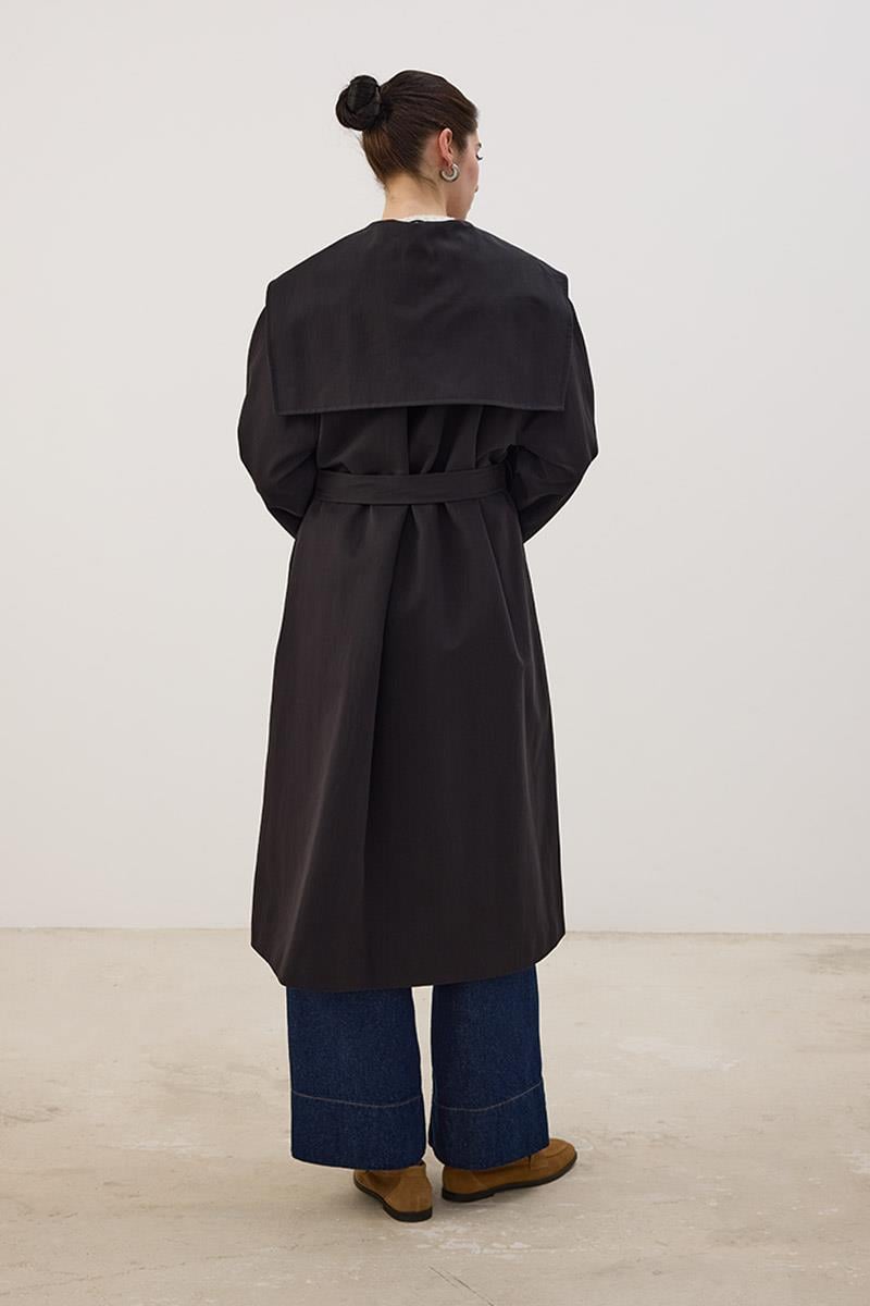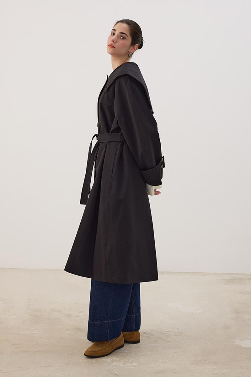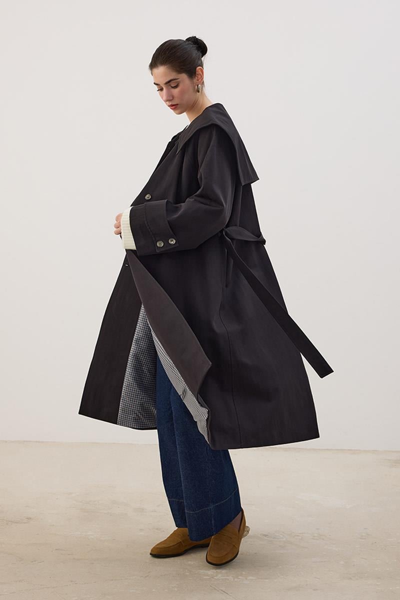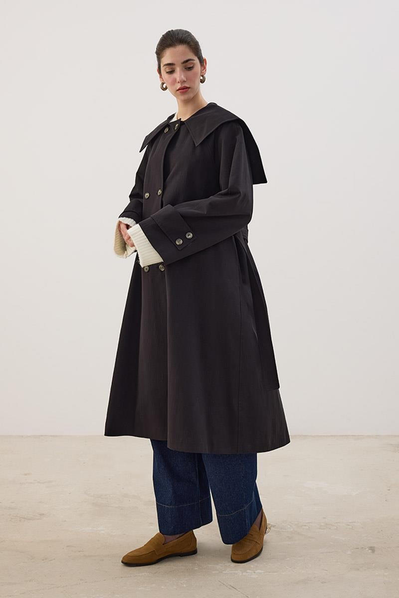 Wide Collar Long Trench Coat in Black