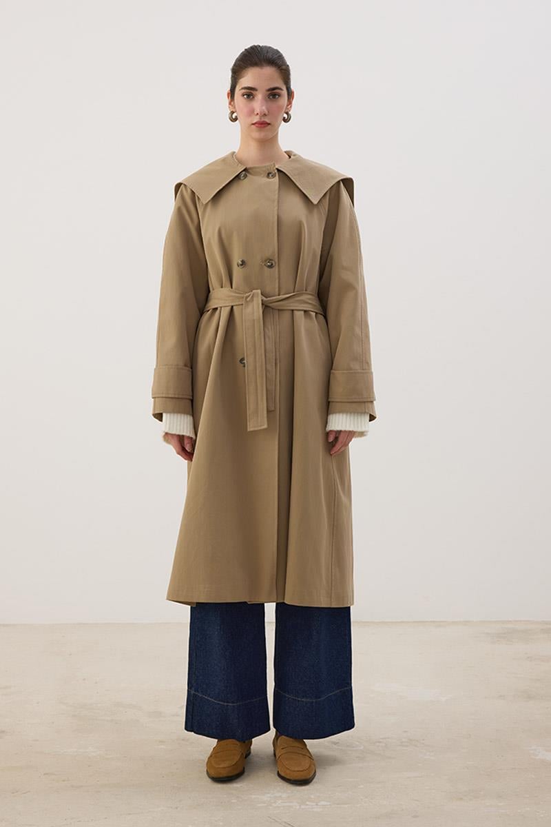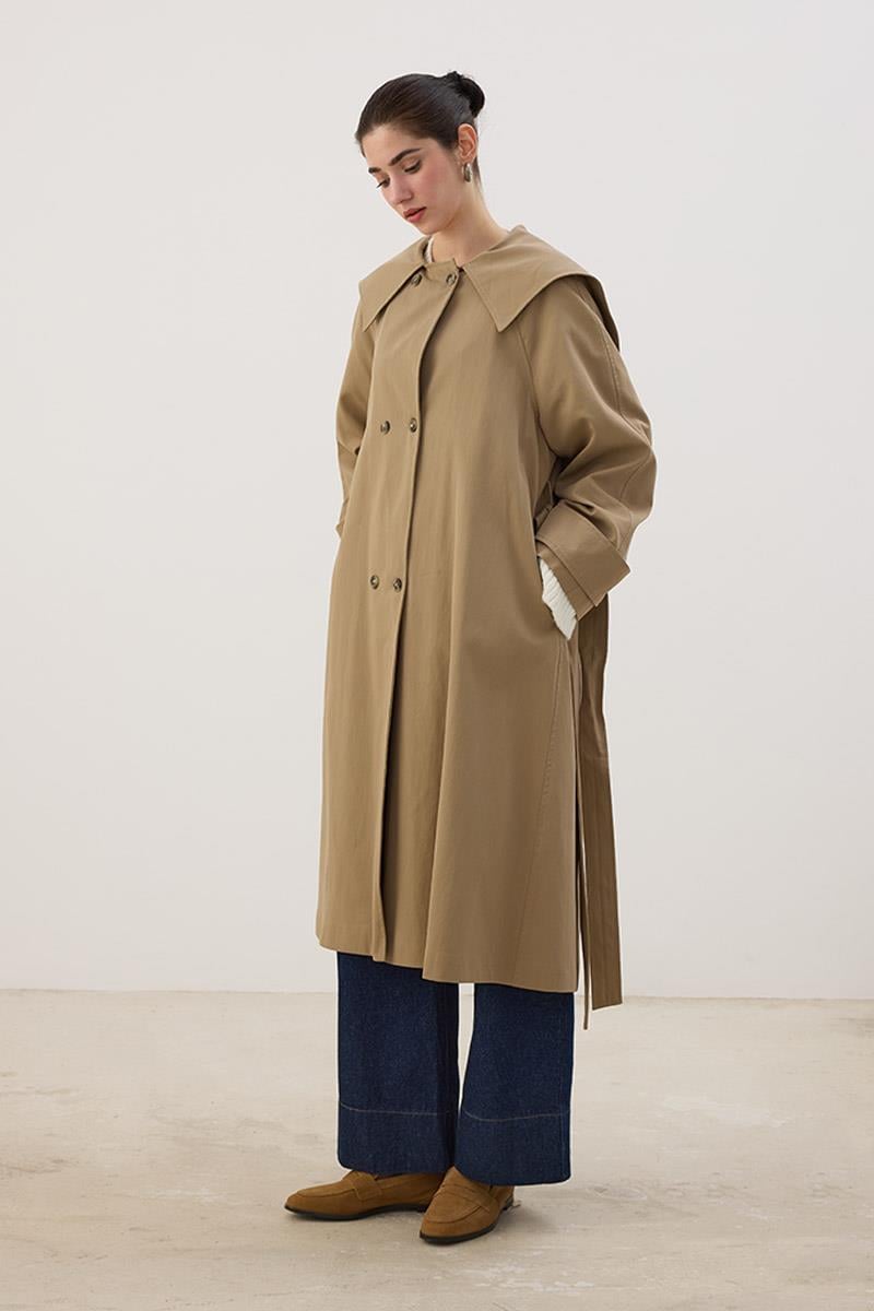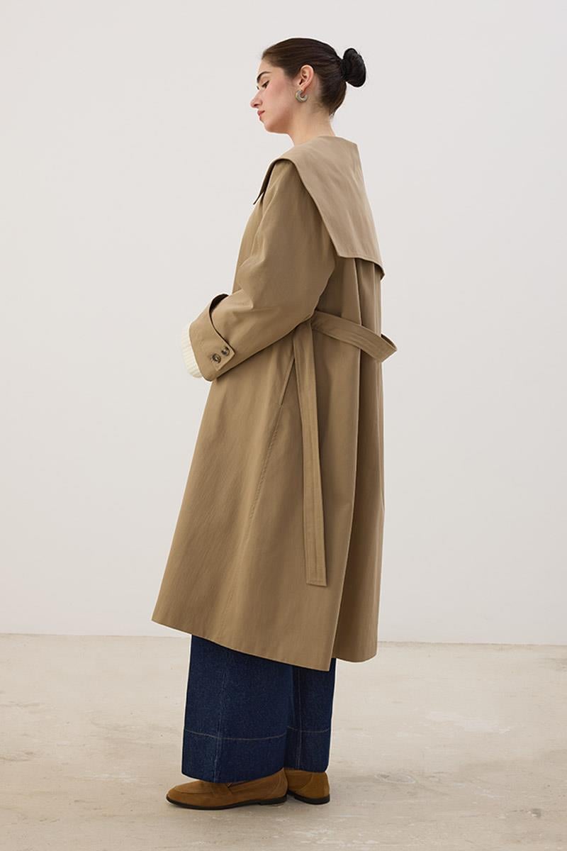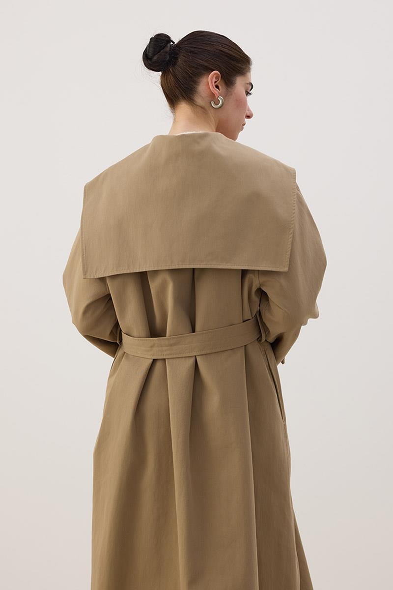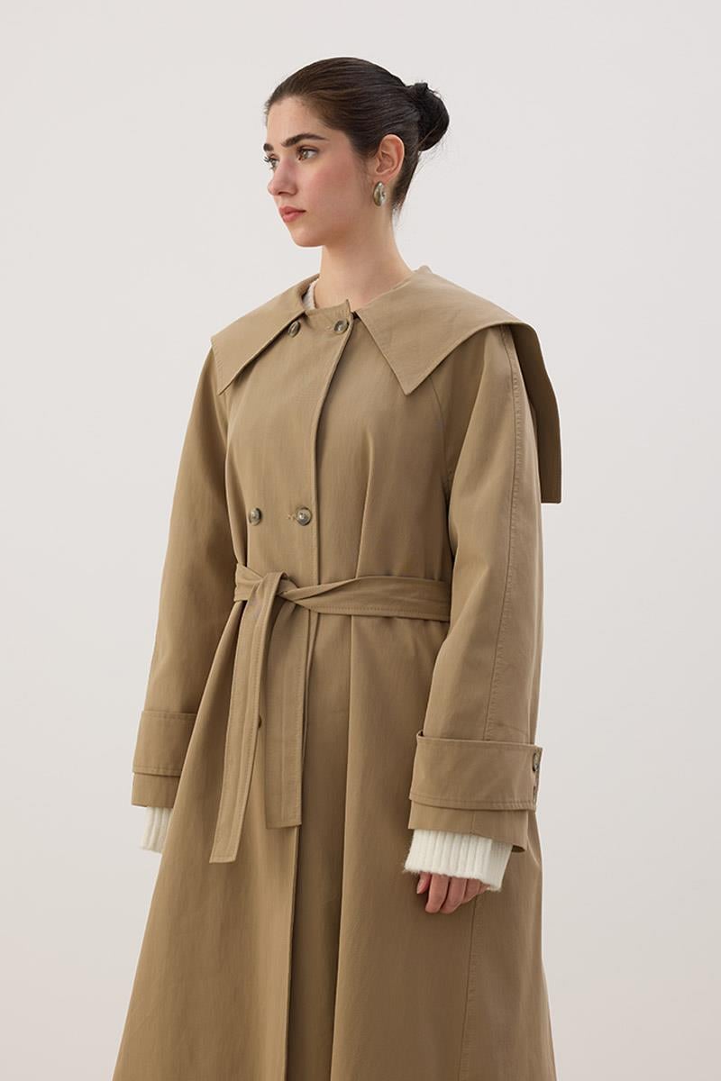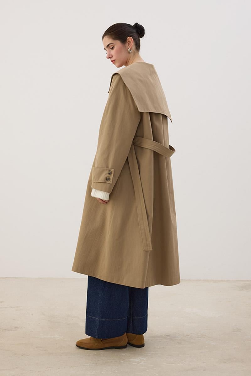 Tags: cotton polyester blend, khaki, long coat, trench coat, wide collar, women's outerwear