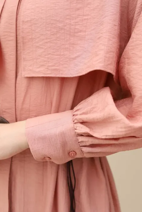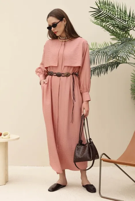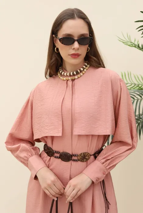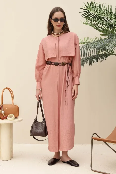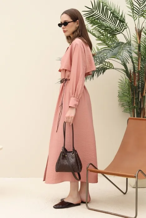 Crafted from a blend of 85% Rayon and 15% Polyamide. The Rayon yarn used in this product is typically sourced from beech, eucalyptus, and bamboo trees. It features a soft texture and elegant drape derived from natural cellulose, giving the fabric a silky feel and breathability. The 20% Polyamide added to the fabric blend provides extra durability, reduced wrinkling, and a subtle sheen. Product measurements are listed below; compare them with your favorite dress for the most accurate fit. BELT NOT INCLUDED. A WAIST TIE MADE FROM THE SAME FABRIC IS INCLUDED. Length: 134 cm (Length may vary by 1-5 cm between productions). Size Chart: Chest, Hips, Sleeve. Size 36: 128 cm, 130 cm, 46 cm. Size 38: 132 cm, 134 cm, 48 cm. Size 40: 136 cm, 138 cm, 50 cm. Size 42: 140 cm, 142 cm, 52 cm. Model Measurements: Height: 176 cm, Bust: 85 cm, Waist: 62 cm, Hips: 92 cm. Model is wearing Size 36.