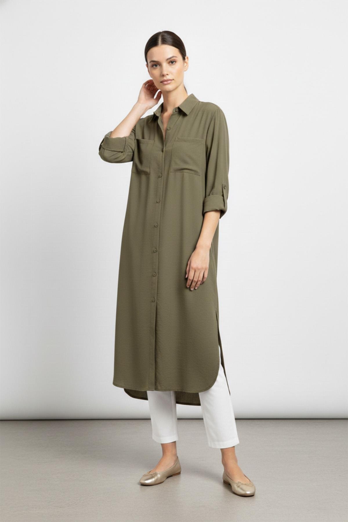 Description: A stylish shirt dress suitable for daily wear, featuring a comfortable oversize fit and long cut. The button-front design offers practical use, while chest pockets add a modern detail to the model. Thanks to its lightweight structure, it’s ideal for seasonal wear. Can be easily styled as a standalone dress or as a tunic. Adapts well to daily, casual, and urban styles.