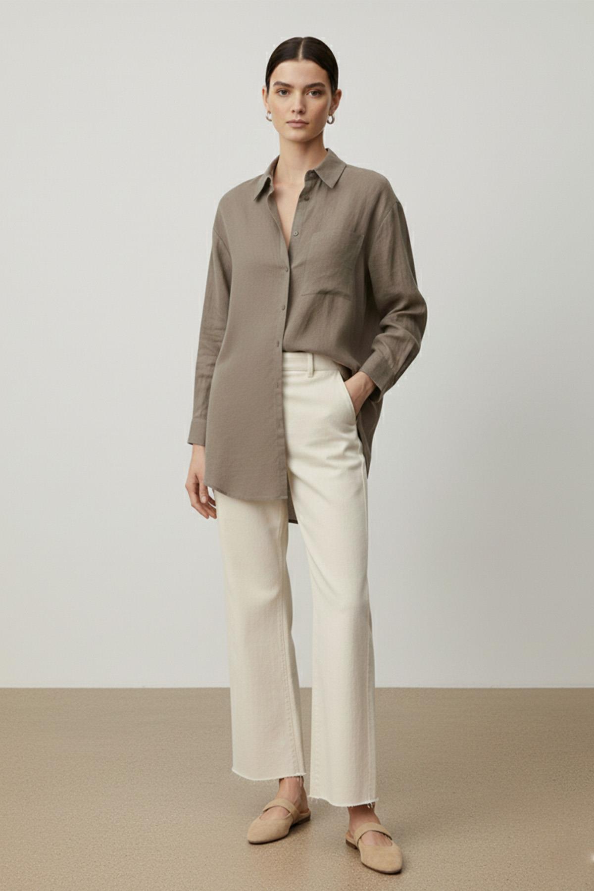 Description: This long sleeve button-down loose shirt stands out with its comfortable cut and simple design, offering comfortable wear for daily and office outfits. Thanks to its fluid structure, it fits comfortably on the body and provides freedom of movement all day long. With its long form, this women’s shirt can also be worn as a tunic and easily paired with trousers and leggings. Featuring a minimal design, this timeless style shirt becomes a lifesaver piece in your wardrobe.