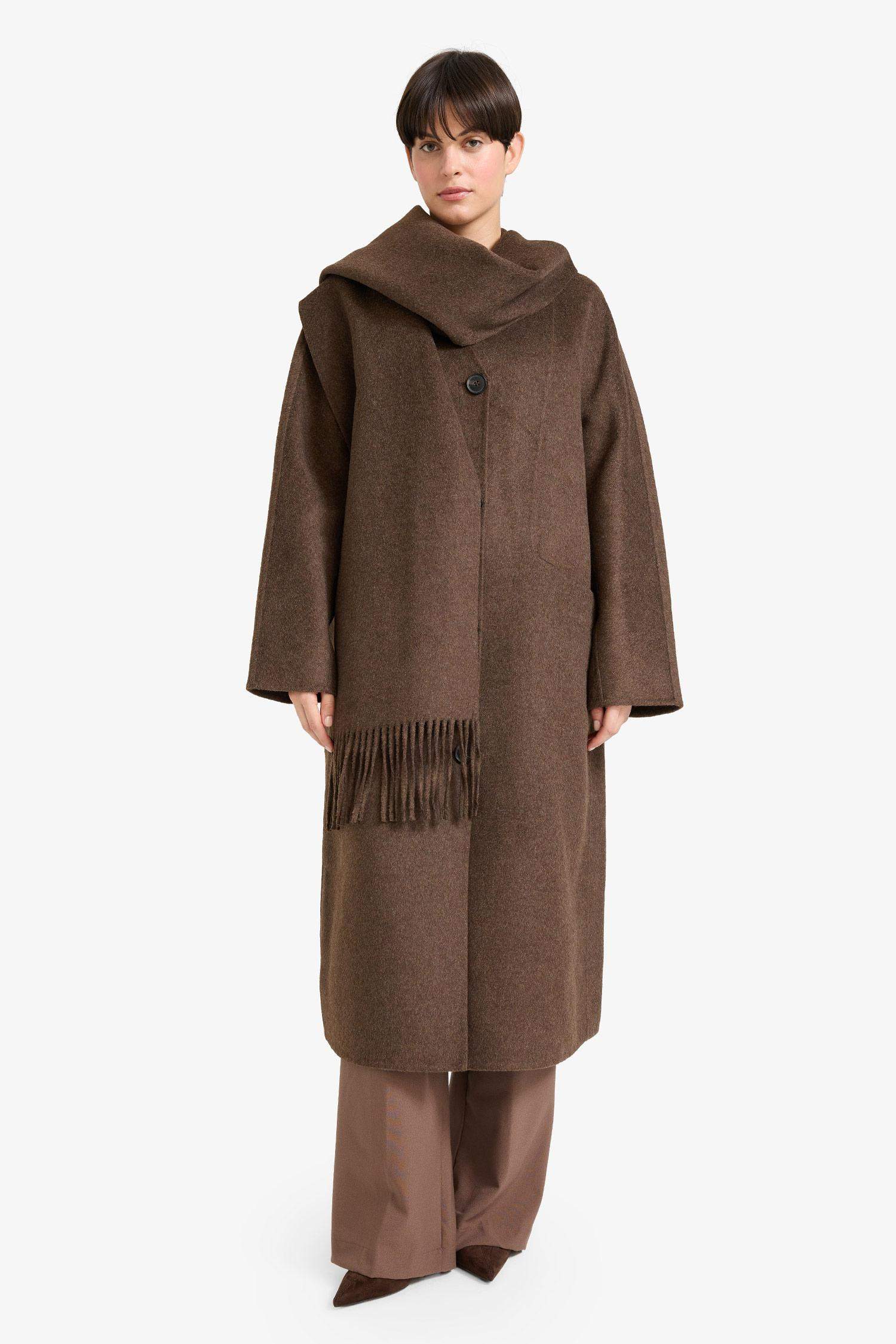 Tags: coffee, long cashmere coat, parka, relaxed fit, removable scarf, women's coat, wool blend