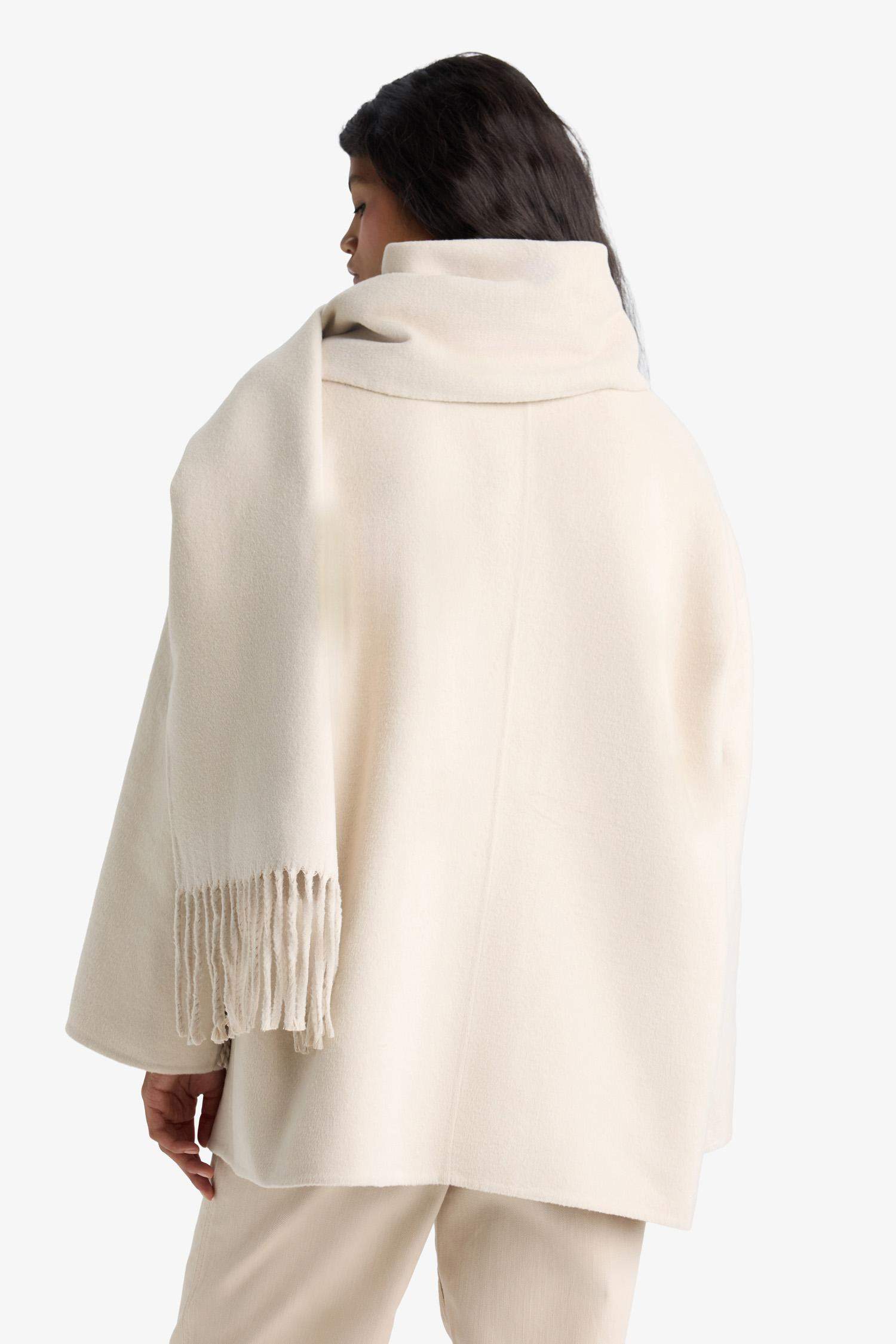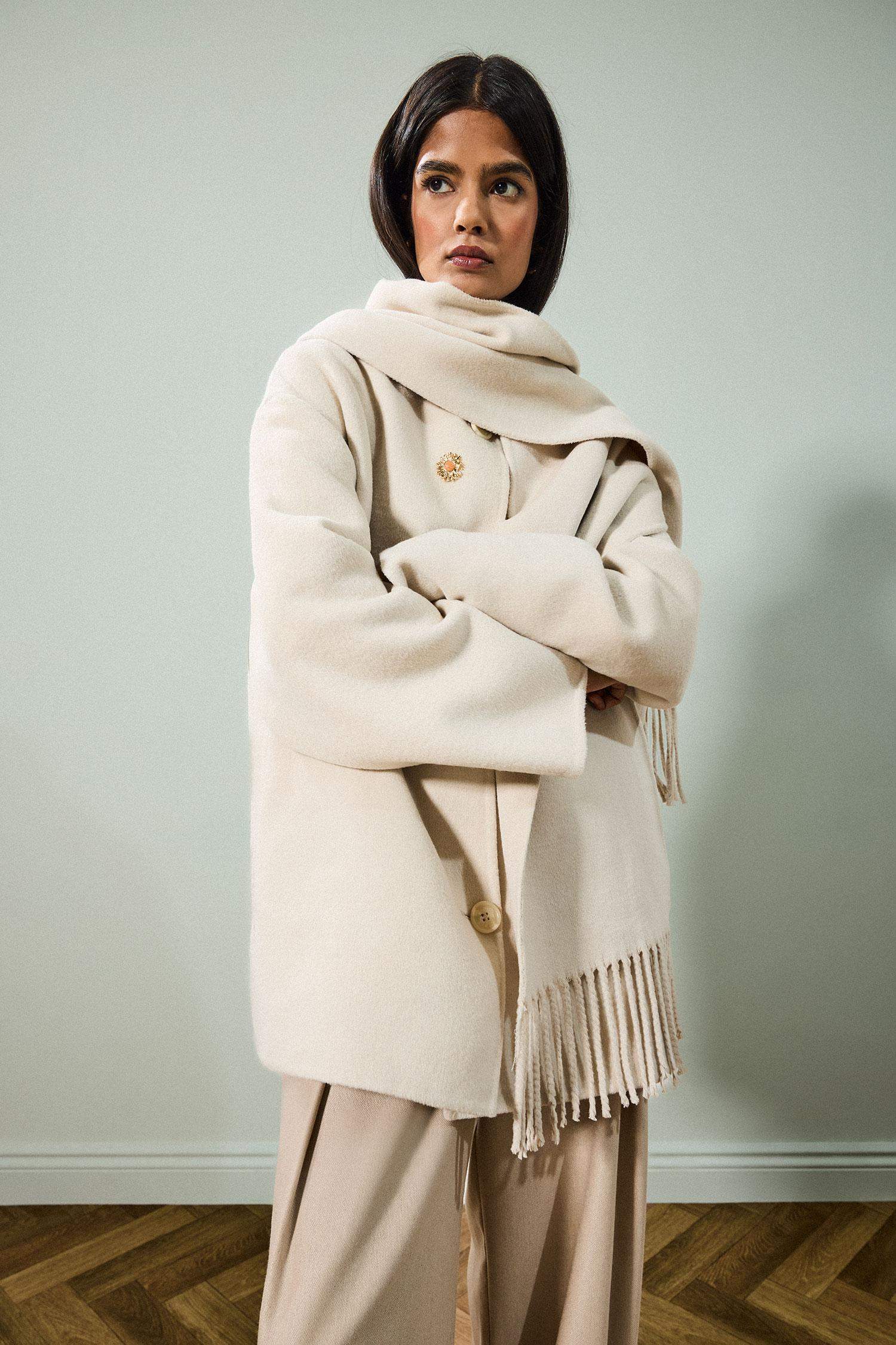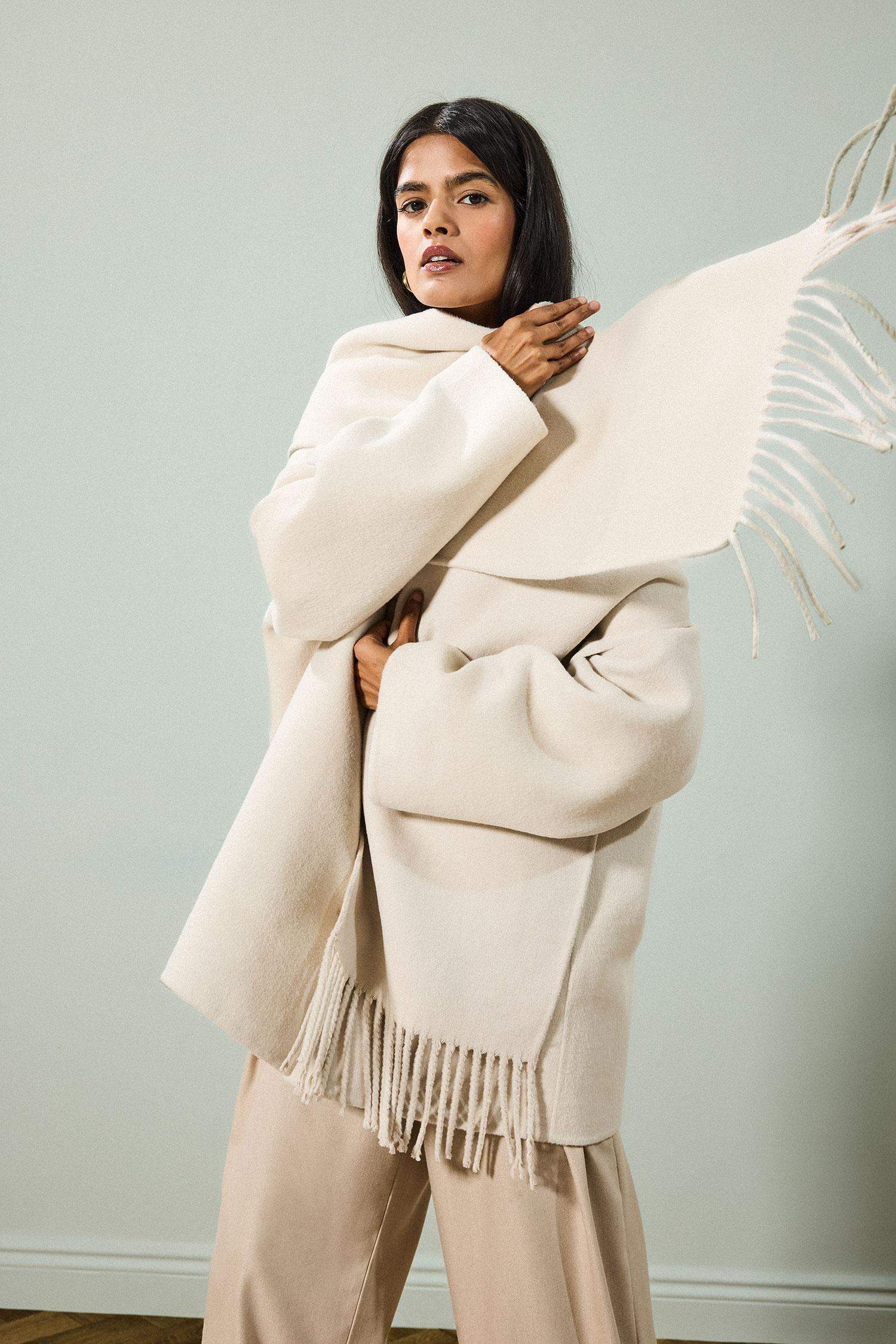 Tags: buttoned coat, cashmere coat, long coat, relaxed fit, removable scarf, warm coat, winter coat, wool blend coat