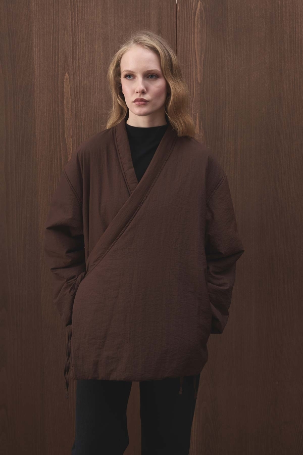 ANVELOP WRAP TIE INFLATABLE COFFEE COAT FEATURES Kimono collar, tie detail, dropped shoulders, hidden pocket detail, comfortable cut, unlined wrap tie inflatable coat. CONTENT AND CARE 100% Polyester Dry cleaning recommended. Hand measurements may vary by 2-3 cm. Model Size: S-M Model Measurements: Height 174 cm, Bust 78 cm, Waist 58 cm, Hips 87 cm
