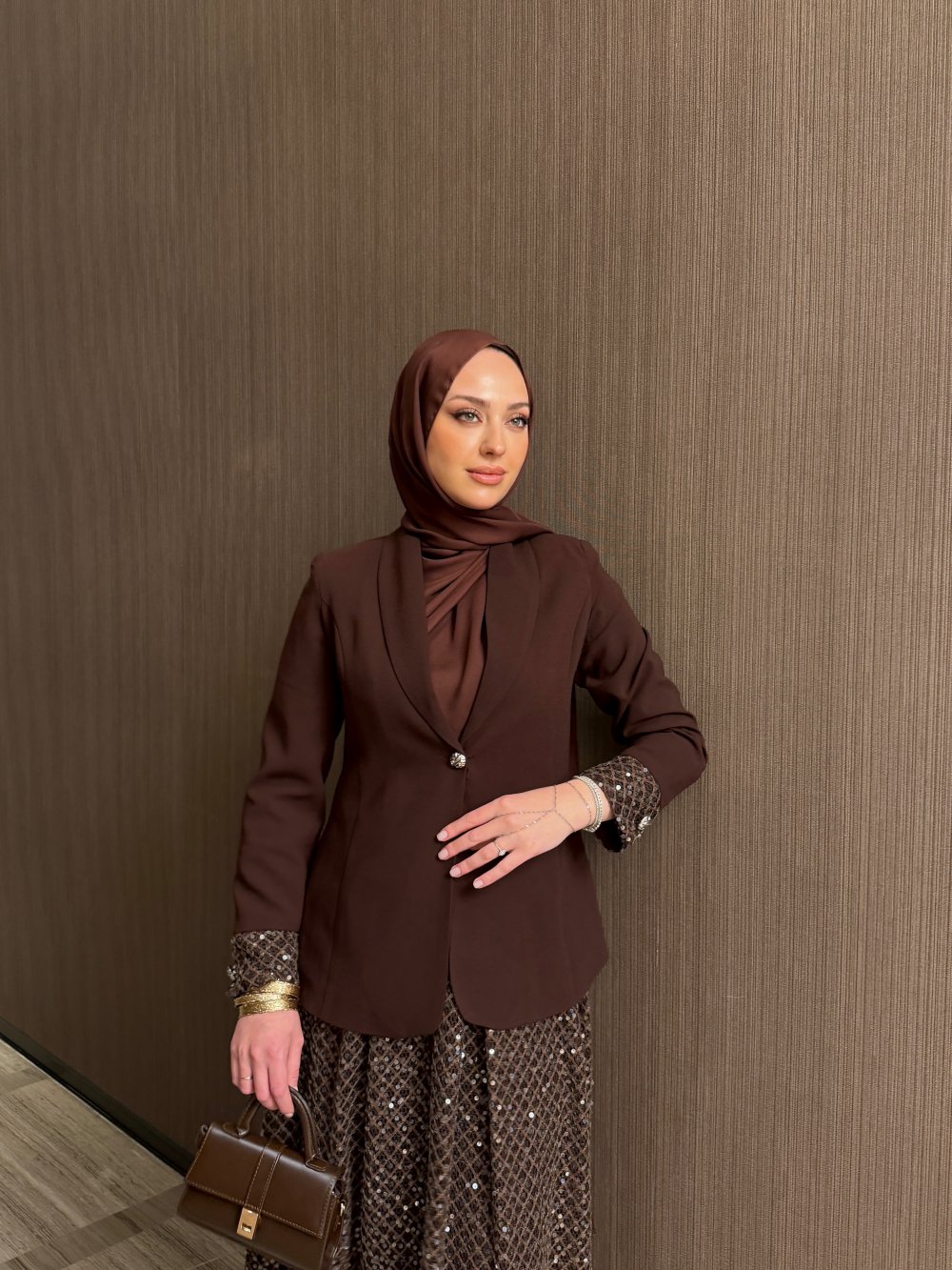 Tags: coffee color, crepe fabric, fashion set, sequin detail, skirt outfit, women's clothing