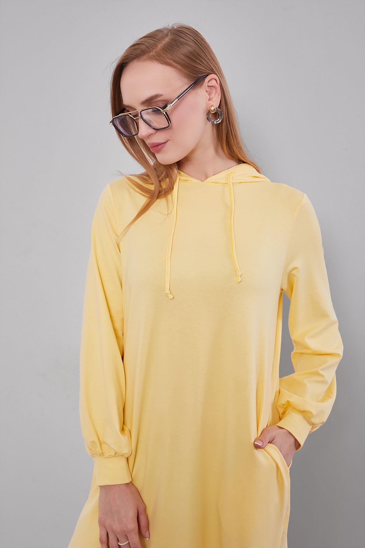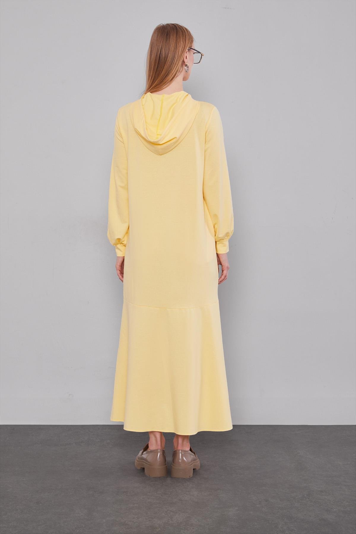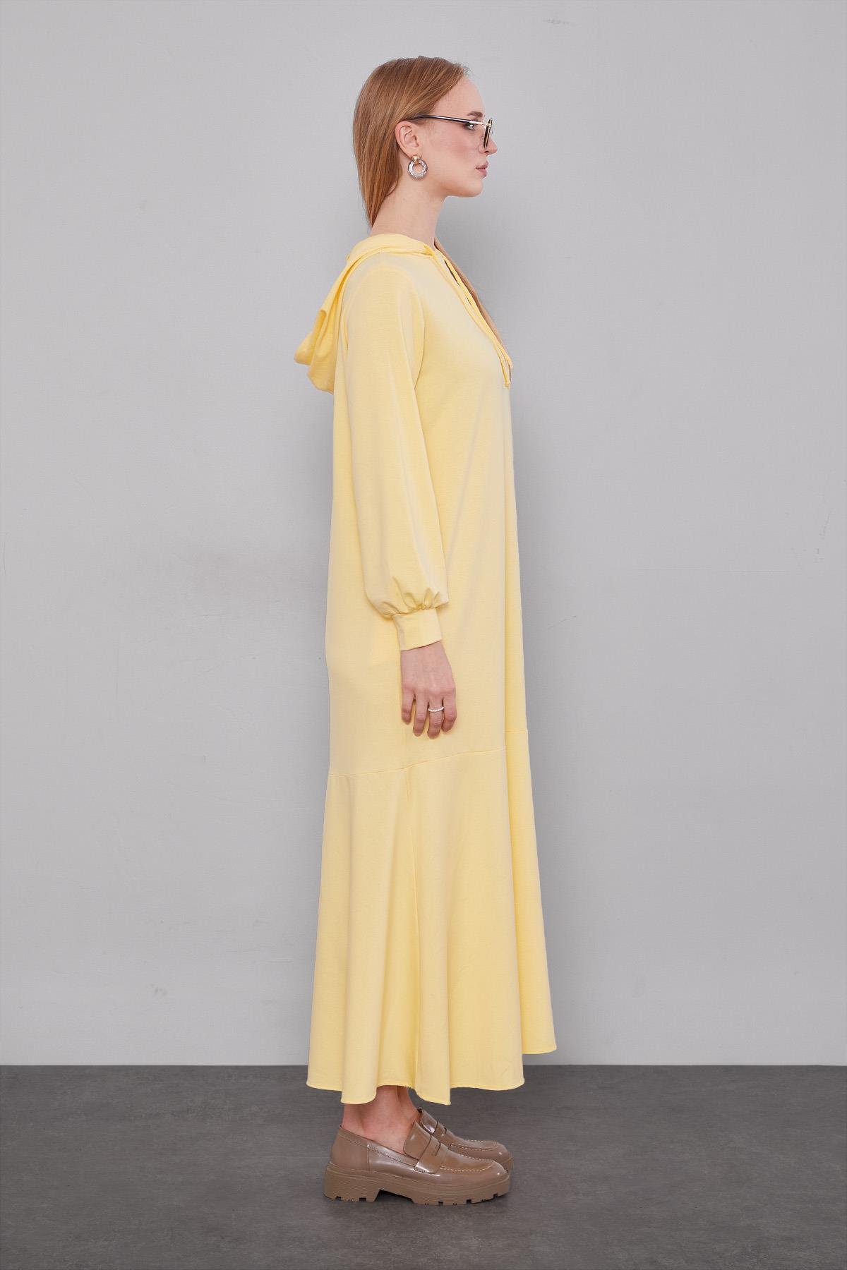 Tags: flounce detail, four-season fashion, hidden pocket, hooded dress, viscose dress, yellow dress