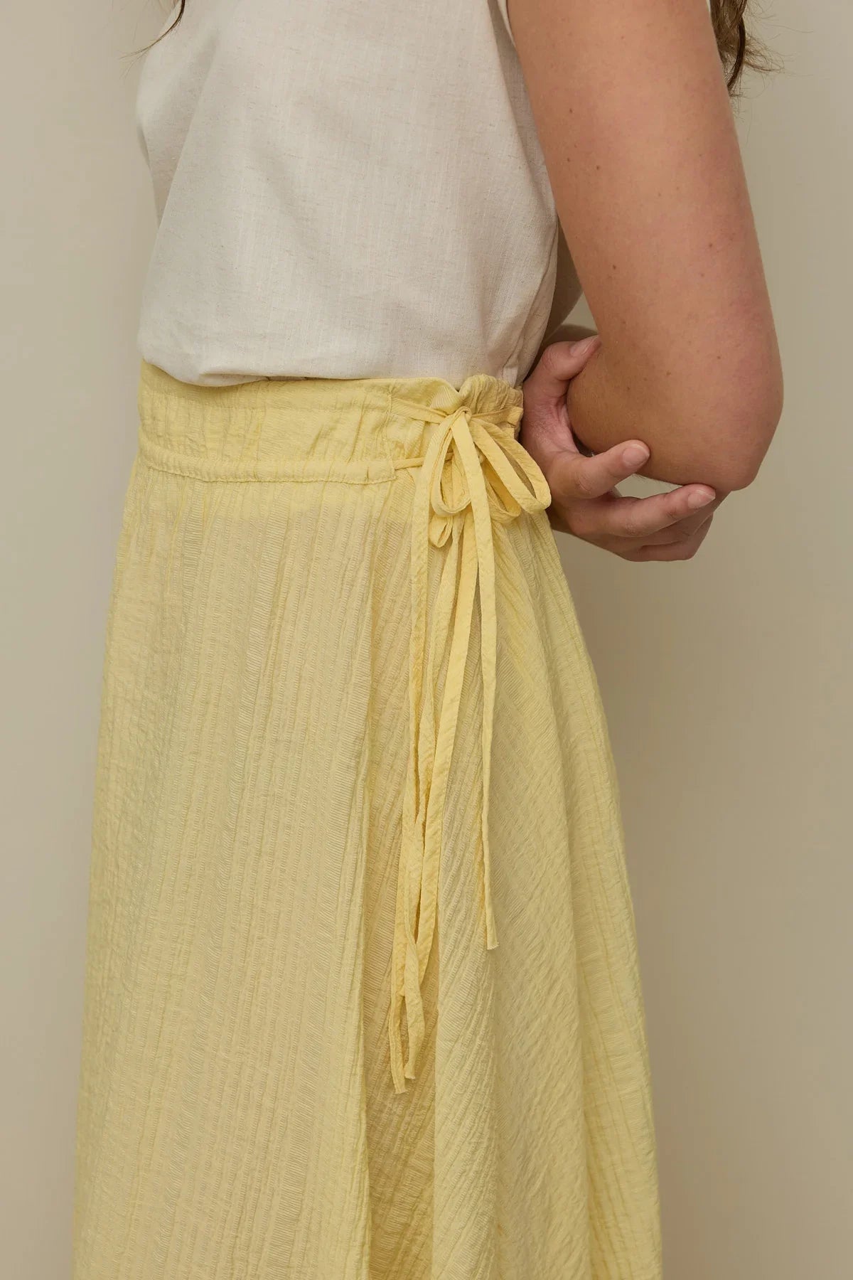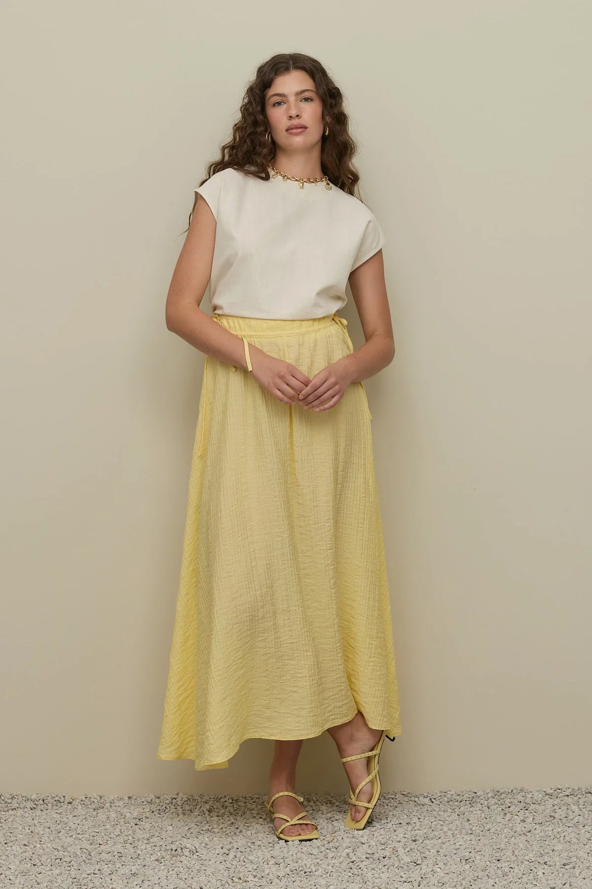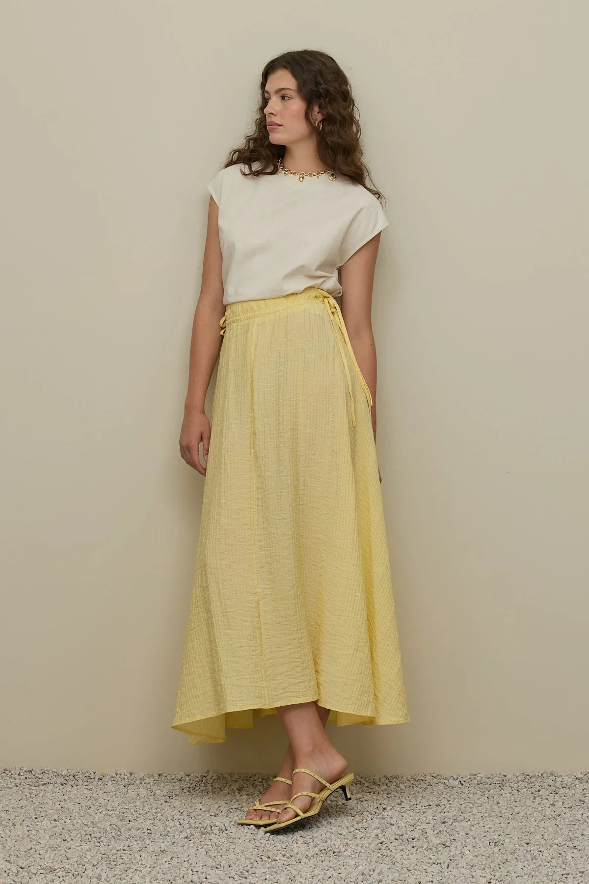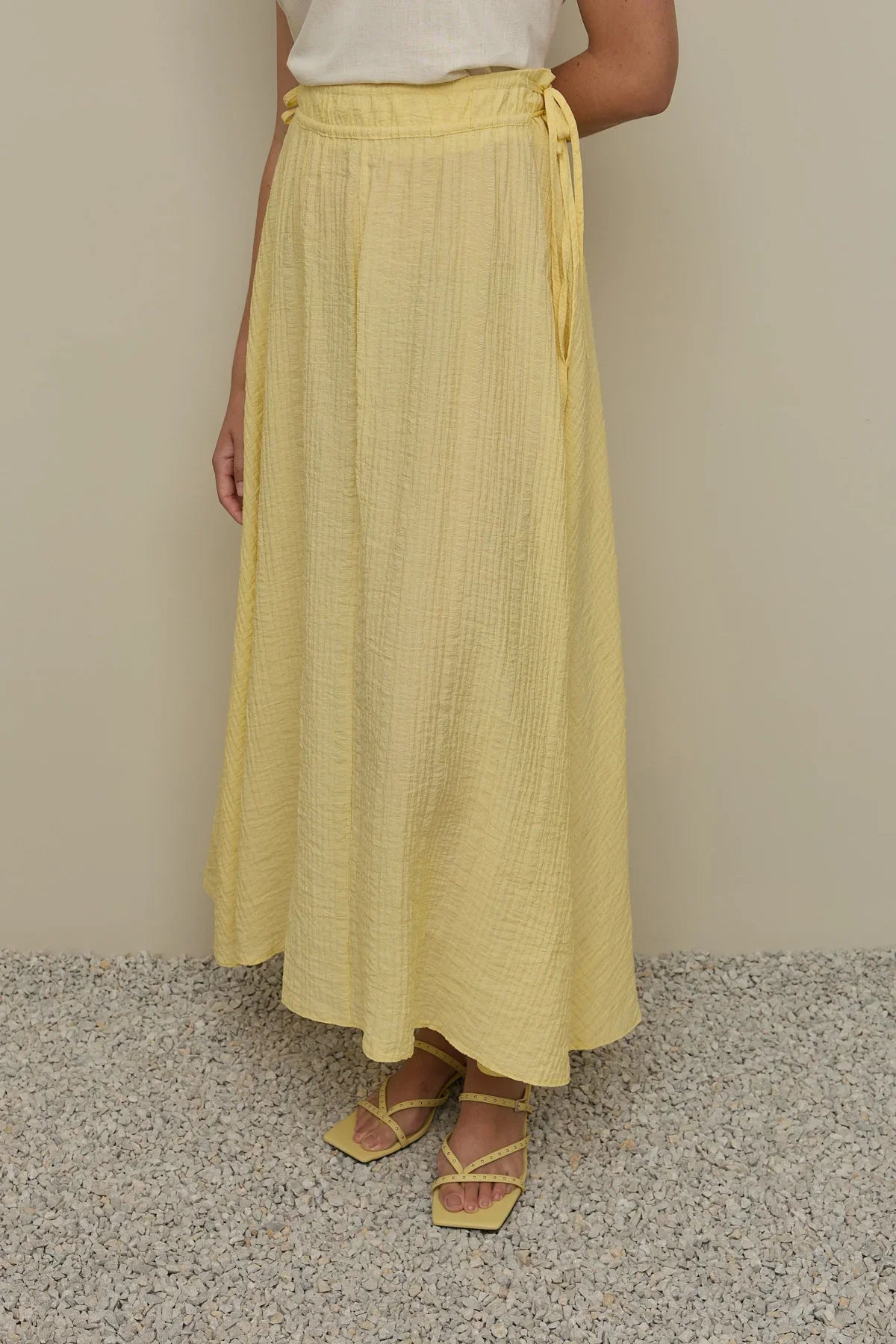 Tags: drawstring, maxi skirt, tie detail, yellow