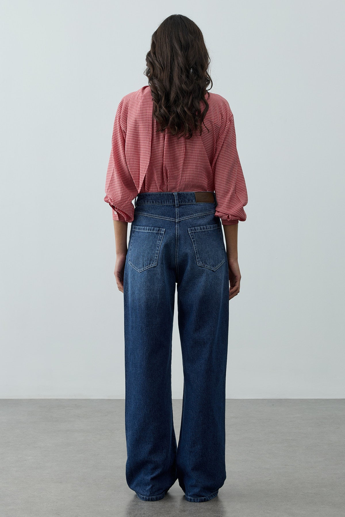 Denim dokuma kumaştan, yüksek belli, beş cepli jean. Ekstra uzun, geniş paça. Fermuarlı ve metal düğmeli ön kapama.