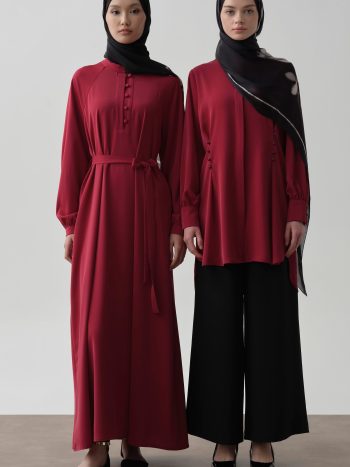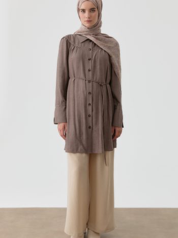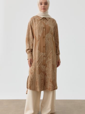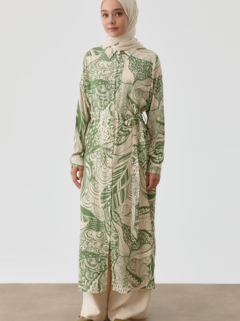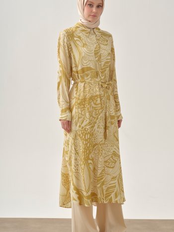 This long tunic, with its elegant patterns and belt detail at the waist, offers a feminine silhouette, combining elegance and