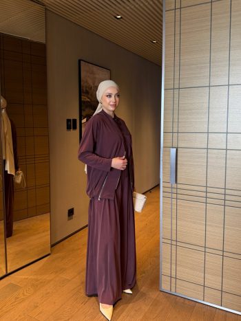 Aliye Three-Piece Set in Burgundy This product consists of three pieces. The top features short sleeves. Top shoulder measurement: 40cm