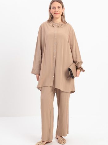 Achieve a modern and comfortable style with our Plus Size Linen Trousers Suit featuring mink-gather details. Explore other models in